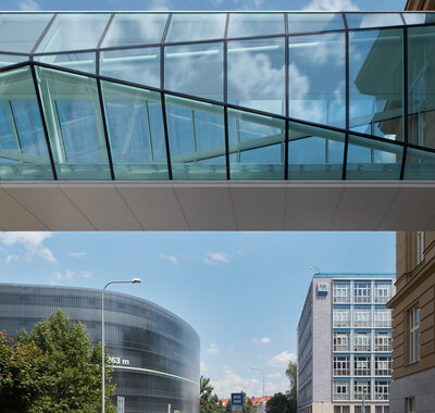 Pěkné lávky, s myšlenkou, které tam ale nemají co dělat. Sem, dle mého mínění, patří základní ocelová konstrukce řešená opticky pomocí vodorovných prutů, které by korespondovaly s prvky okolní fasády.