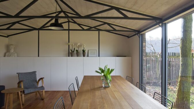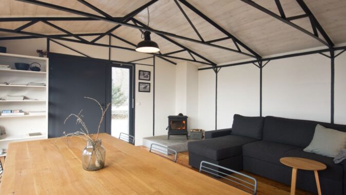 Při rekonstrukci dílny na společenskou místnost byly svařované nosné konstrukce zachovány. Vizuální propojení interiéru s exteriérem se zajistilo vybouráním třech panelů z jihozápadní strany a osazením velkoformátových tepelně izolačních dvouskel tamtéž. Ostatní obvodové stěny byly osazeny tepelně izolačními deskami Rockwool 100 mm a z vnější strany modřínovými palubkami. Namísto plechových vrat byly na severozápadní straně osazeny lakované plné dveře s větracím oknem. Střecha je rovněž zateplena minerální vatou, v interiéru je pobita modřínovými palubkami natřenými na bílou barvu, z vnější strany je borovicový záklop a asfaltové pasy jako střešní krytina. Podlahu tvoří původní betonová deska, rošt a desky Rockwool 80 mm + modřínové palubky. Svítidla industrial originál 30. léta 20. století.