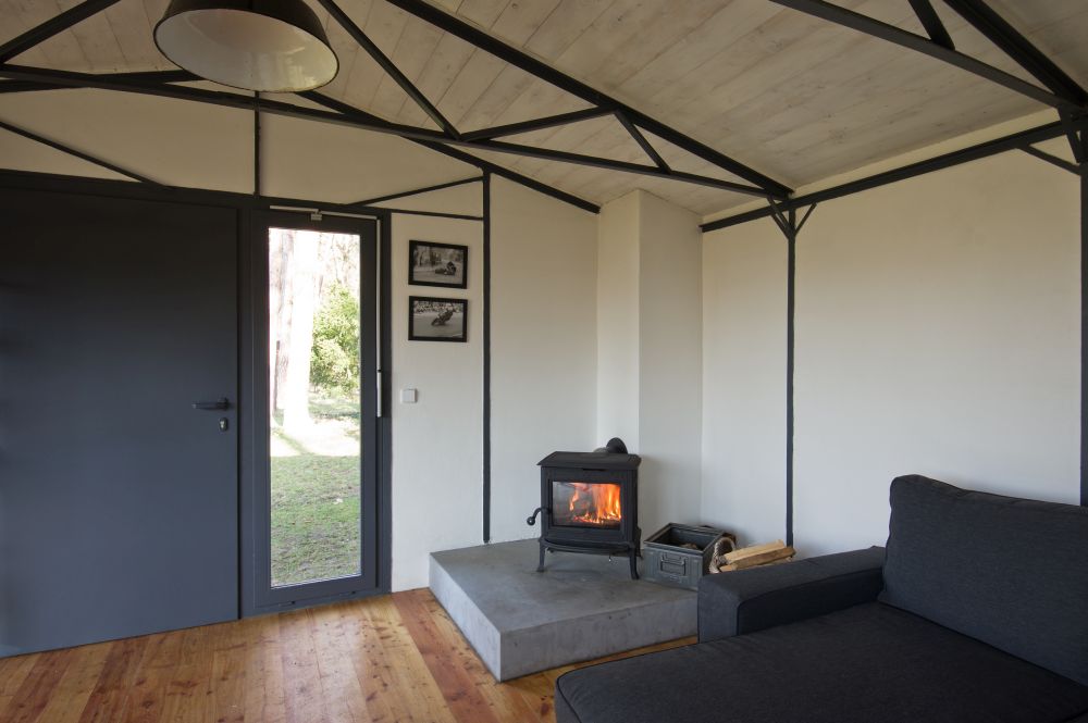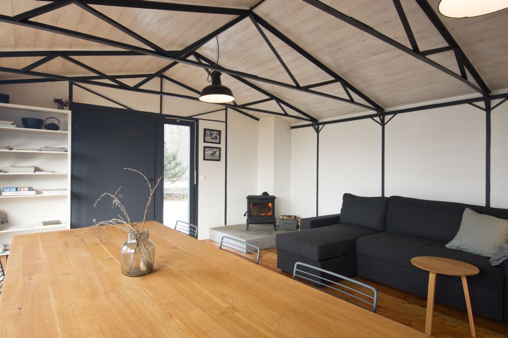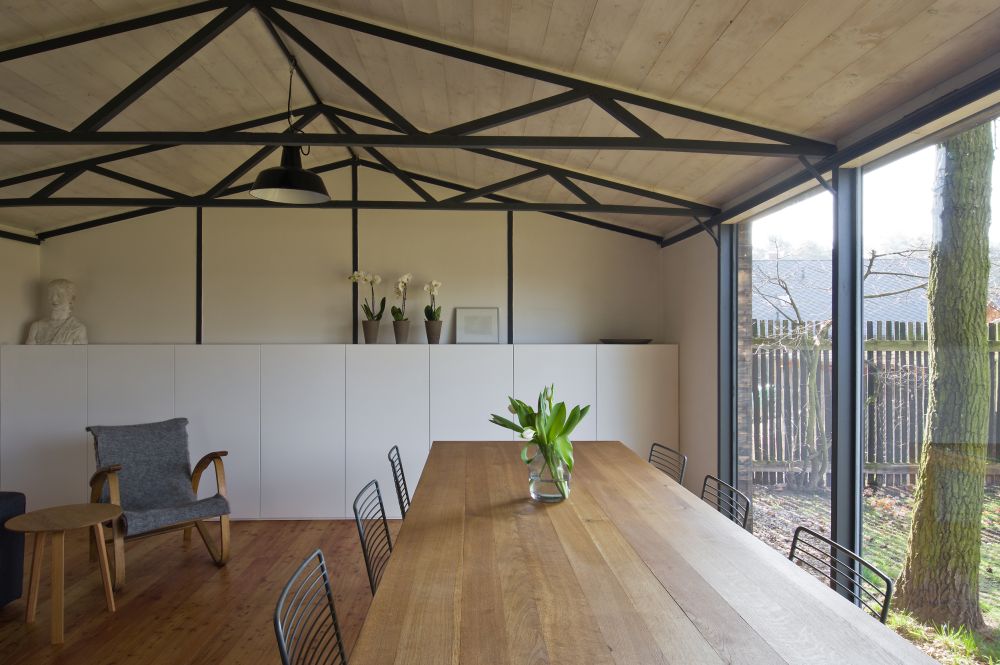 Při rekonstrukci dílny na společenskou místnost byly svařované nosné konstrukce zachovány. Vizuální propojení interiéru s exteriérem se zajistilo vybouráním třech panelů z jihozápadní strany a osazením velkoformátových tepelně izolačních dvouskel tamtéž. Ostatní obvodové stěny byly osazeny tepelně izolačními deskami Rockwool 100 mm a z vnější strany modřínovými palubkami. Namísto plechových vrat byly na severozápadní straně osazeny lakované plné dveře s větracím oknem. Střecha je rovněž zateplena minerální vatou, v interiéru je pobita modřínovými palubkami natřenými na bílou barvu, z vnější strany je borovicový záklop a asfaltové pasy jako střešní krytina. Podlahu tvoří původní betonová deska, rošt a desky Rockwool 80 mm + modřínové palubky. Svítidla industrial originál 30. léta 20. století.