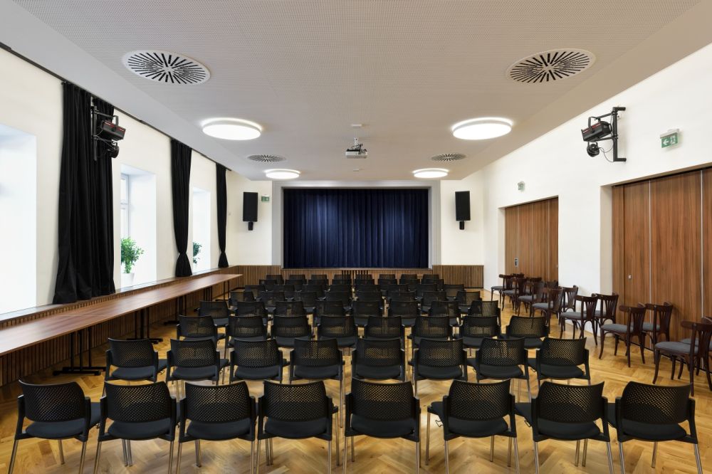 místě. Při prohlídce stavby nás ale zaujal společenský sál v nejstarší části objektu