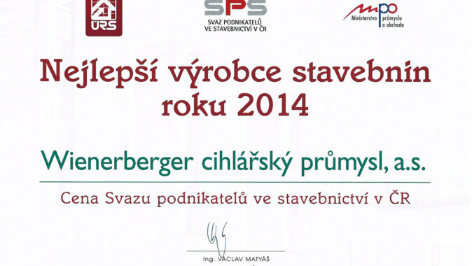 Společnost Wienerberger cihlářský průmysl získala poděkování za podporu odborných škol a učňů formu soutěže SUSO (Soutěžní přehlídky stavebních řemesel 2014/2015), které je společnost Wienerberger generálním partnerem již 18 let.