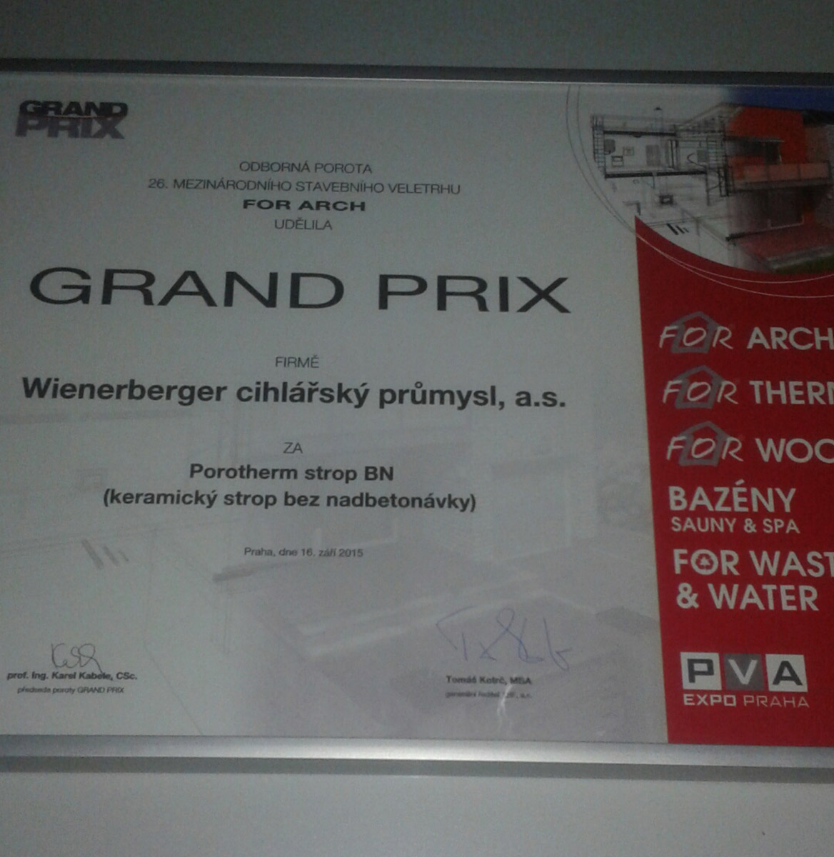 Druhý den mezinárodního stavebního veletrhu, 16. září 2015, byly slavnostně předány ceny Grand Prix pro nejinovativnější výrobky stavebních veletrhů a ocenění za nejpoutavější expozici Top Expo. Stalo se tak na galavečeru mezinárodního veletrhu FOR ARCH. Cenu Grand Prix si společnost Wienerberger cihlářský průmysl, a. s. odnesla za inovativní řešení nosné stropní konstrukce pro svépomocnou výstavbu umožňující snížení konstrukční výšky, hmotnosti a pracnosti (Strop Porotherm BN – strop bez nadbetonávky).