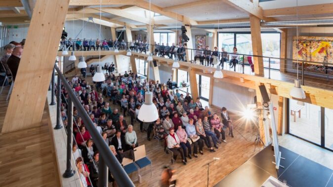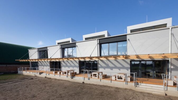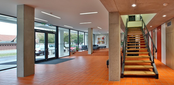 Stavba má dvě tváře: vstupní průčelí je vsazeno do