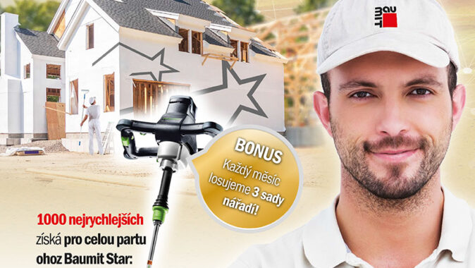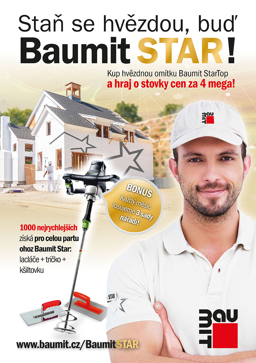 Soutěž „Staň se hvězdou, buď Baumit STAR!“ umožňuje stavebním pracovním partám získat zkušenosti s aktuální produktovou novinkou roku 2018 – tenkovrstvou omítkou Baumit StarTop. Soutěž s atraktivními cenami má dvoustupňový formát, ve kterém bude u všech účastníků rozhodovat nejprve rychlost ve volbě a zakoupení minimálního poču 10 kbelíků omítky Baumit StarTop a zaslání daňového dokladu elektronickou formou (fotografie nebo scan faktury) na speciálně zřízenou e-mailovou adresu baumitstar@baumit.cz. Prvních 1000 účastníků, kteří tímto způsobem vstoupí do soutěže získá kompletní sadu pracovního oblečení pro celou partu (max. 4 sady – pracovní kalhoty, tričko a kšiltovka).