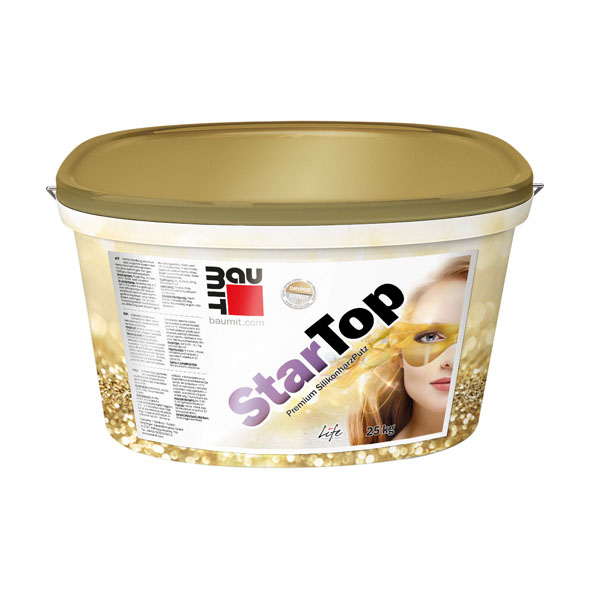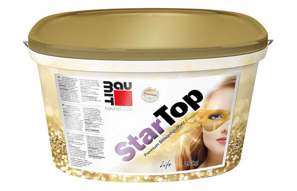Zcela nová prémiová omítka Baumit StarTop patří do skupiny fasádních tenkovrstvých omítek. Díky unikátnímu multifunkčnímu drypor efektu účinně brání špinění fasády a růstu řas a plísní na jejím povrchu, čímž zajišťuje její dlouhodobou krásu. Speciálně vyvinutá receptura omítky zvyšuje, díky snadné zpracovatelnosti, produktivitu při jejím nanášení i strukturování na povrchu fasády. Mezi další výrazné výhody patří rovněž vysoká paropropustnost, široká nabídka struktur povrchu a v neposlední řadě také možnost aplikace v brilantních odstínech vzorníku Baumit Life, nejšiřší kolekce fasádních barev v Evropě.
