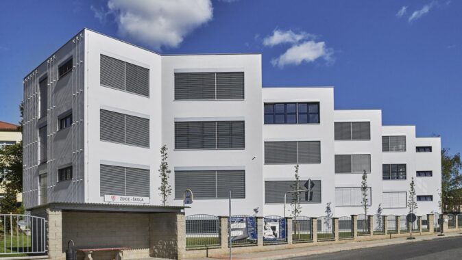 Svěží, neotřelý a prostorově objevný architektonický koncept dostavby školní budovy využívá zužující se tvar stavebního pozemku k vytvoření ústřední trojúhelníkové komunikační, shora prosklené třípodlažní haly, ze které jsou přístupné jednotlivé učebny. Do ulice se škola vymezuje pilovitě ustupujícími objemy kvádrů jednotlivých tříd umožňujících jejich vhodné oslunění. Barevné i materiálové řešení interiérů i vnější výraz novostavby působí proporčně vyváženě, zároveň velkoryse a radostně. Architektura domu pomáhá vytvořit charismatické prostředí k edukaci mladé generace.