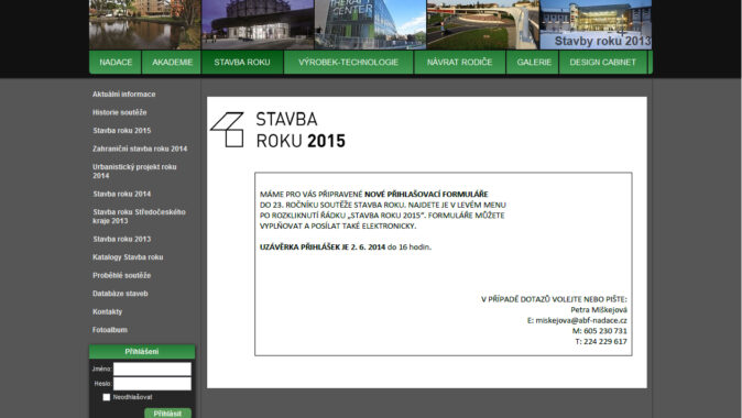 Přihlášky do soutěže jsou přijímány od začátku dubna až do 2. června 2015. Stavba roku 2015 se snaží postihnout co největší spektrum architektonické práce. Přihlášeny mohou být stavby nové i rekonstruované, urbanistické realizace veřejného prostoru, úpravy krajiny, pozemní bytové i nebytové budovy, inženýrské a dopravní stavby i specifická stavební díla. Toto široké rozkročení je patrné v tom, že titul Stavba roku bude porotou udělen nejvýše 5 stavbám a to bez rozlišení pořadí a kategorií. „Architektonická díla napříč kategoriemi jsou často nesouměřitelná, nepopiratelná kvalita návrhu a provedení je ovšem poznatelná i na pracích různého rozsahu. Díky tomuto způsobu hodnocení mohou být vítězi se stejnou hodnotou například stavby hotelu, výzkumného centra, rodinného domu nebo nově rekonstruované náměstí. Zároveň se ale mohou titulem Stavby roku 2015 pyšnit i zástupci jedné kategorie. Rozhodujícím měřítkem je kvalita,“ vysvětluje člen poroty Ing. arch. akad. arch. Jan Vrana a dodává, že na titul Stavba roku 2015 nominuje porota maximálně 15 staveb. Ve hře je ovšem ještě 12 Zvláštních cen, které jsou již úžeji zaměřené. Najdete mezi nimi ocenění věnované energeticky úsporné budově, dopravní, bytové či průmyslové stavbě, ale i architektonickému detailu.