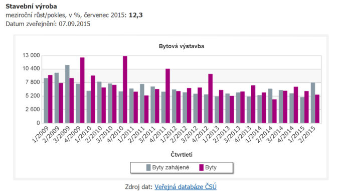 Počet zahájených bytů v červenci 2015 meziročně klesl o 14,5 % a dosáhl hodnoty 2 249 bytů. V rodinných domechdošlo k poklesu počtu bytů o 0,8 %, v bytových domech byl zaznamenán pokles počtu zahájených bytů o 34,9 %.