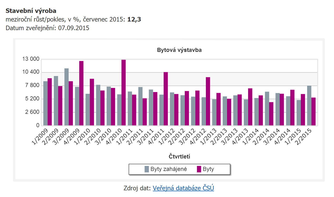 Výrazný růst stavební produkce pokračovalStavební produkce v červenci 2015 vzrostla meziročně reálně o 12,3 %. Stavební úřady vydaly meziročně o 12,0 % stavebních povolení méně a orientační hodnota těchto povolení klesla o 11,8 %. Bylo zahájeno meziročně o 14,5 % bytů méně.