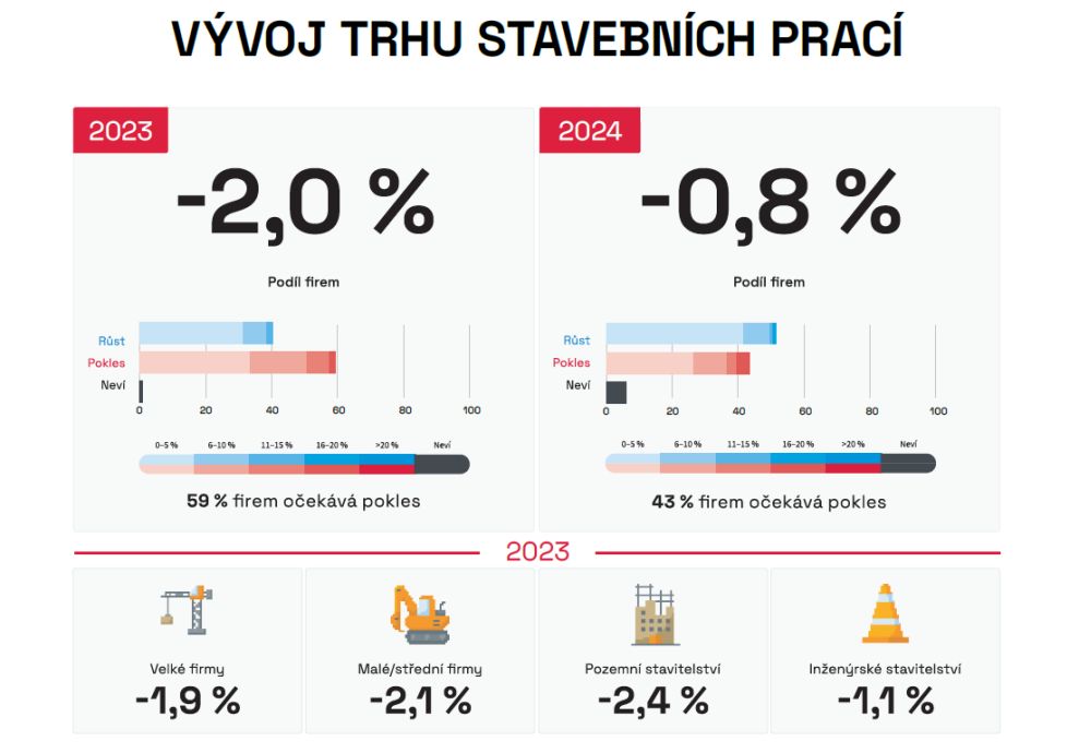 Lehce optimističtější jsou ředitelé stavebních společností v predikci pro rok 2024, kdy očekávají sice také klesající trend, nicméně pouze minimální pokles trhu o –0,8 %. S nadějí se do budoucna dívá Ivan Bartoš, místopředseda vlády a ministr pro místní rozvoj ČR: „Vývoj českého stavebnictví lze hodnotit z mnoha pohledů. Ministerstvo pro místní rozvoj jako gestor stavebního zákona a zákona o zadávání veřejných zakázek vidí příležitost právě v těchto právních normách. Nový stavební zákon na konci května podepsal prezident. Konečně máme na stole pevnou právní normu, která přinese jistotu stabilního právního prostředí projektantům, stavebníkům i ostatním účastníkům ve výstavbě, a přispěje tak i ke stabilizaci stavebnictví obecně. Potenciál bytové výstavby by měl zvýšit koncept dostupného bydlení, na kterém na MMR usilovně pracujeme. Pevně věřím, že nastartuje segment nájemního obecního bydlení, který v České republice zaostává za evropským průměrem,“ říká Ivan Bartoš.
