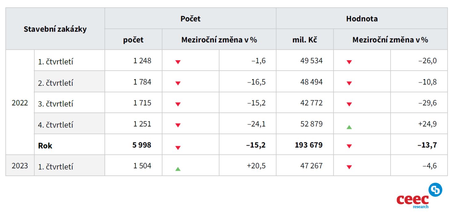Hodnota zadaných zakázek, které byly vysoutěženy a zadány zhotoviteli, za uplynulý rok 2022 klesla o –15,2 %. Jediným pozitivním faktorem za první kvartál 2023 je meziroční růst počtu zadaných zakázek o +20,5 %, ale finanční hodnota těchto veřejných zakázek je meziročně nižší o –4,6 %.  „V oblasti veřejných zakázek, zejména na výstavbu dálnic a silnic, v poslední době sílí konkurenční prostředí, což přirozeně vítáme. Věřím, že se nám tento trend na poli veřejných zakázek podaří udržet, a to i s ohledem na nutnost konsolidace veřejných financí. Musíme si připustit, že nejen občané, ale i stát se bude muset uskromnit. V příštích letech chceme udržet vysoké investiční tempo, v praxi to však znamená, že musíme změnit způsob jeho financování,“ říká Martin Kupka, ministr dopravy ČR.