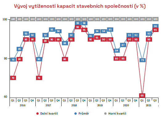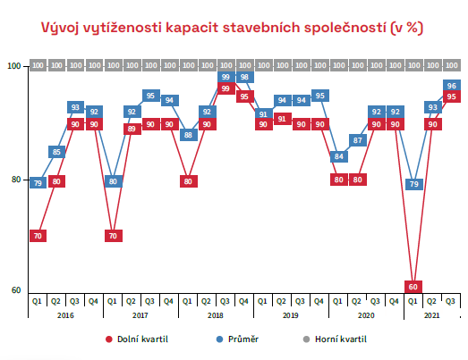 V současné chvíli jsou kapacity stavebních společností vytíženy na 93 %. Ve třetím kvartálu roce letošního roku očekávají dotázané stavební společnosti vytížení vyšší, a to na 96 %.