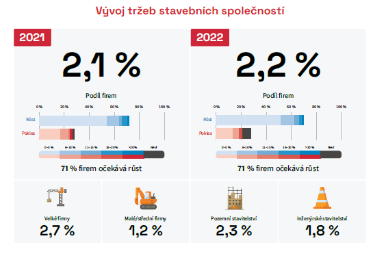 Tržby stavebních společností podle dotázaných ředitelů stavebních společností porostou, a to o 2,1 % v letošním roce a o dalších 2,2 % v roce příštím. S názorem ohledně „tažné síly“ infrastrukturních zakázek souhlasí také Ondřej Novák předseda představenstva společnosti STRABAG a.s.: „Zakázky táhne především dopravní stavitelství. V pozemním stavitelství ochladila investiční aktivitu nejprve nejistota daná pandemií, kterou vystřídala nejistota způsobená překotným růstem cen některých komodit a výrobků z nich, ať už se jedná o ocel, plasty nebo dřevo. Během pandemie byly narušeny výrobní i dopravní řetězce a poptávka tak nyní významně převyšuje nad nabídkou. Pro další vývoj bude nicméně důležité, co nastane po říjnových volbách, tj. zda vláda, která vzejde z dalších voleb bude vnímat, jak velký vliv má její investiční aktivita na vývoj v našem odvětví. Pokud vláda nepostaví stavebnictví na vedlejší kolej, určitě se dokážeme ze současné složité situace prostavět.“