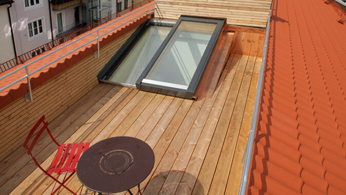 Rekonstrukce podkrovních místností s sebou přináší také možnost využívání střešních teras. I střešní dveře jsou v nabídce společnosti Solara. Podkrovní místnost je díky nim dokonale osvětlená a má pohodlný výstup na terasu, která zajistí další prostor pro Vaše spokojené bydlení.