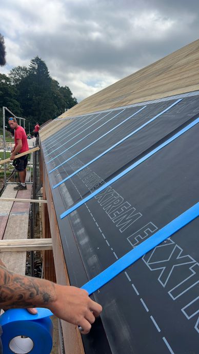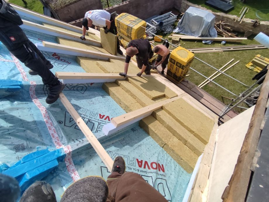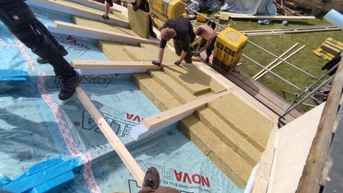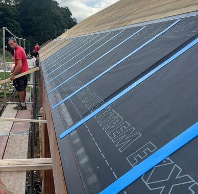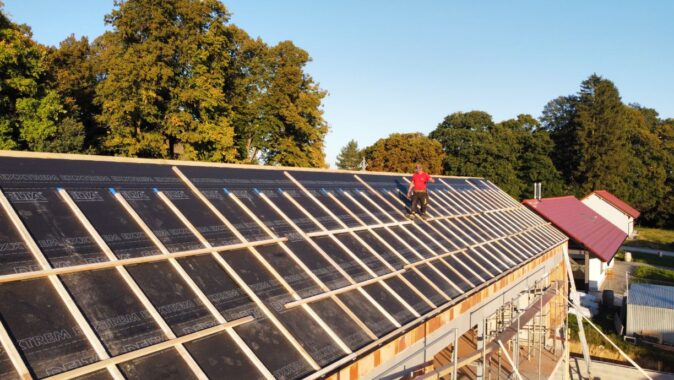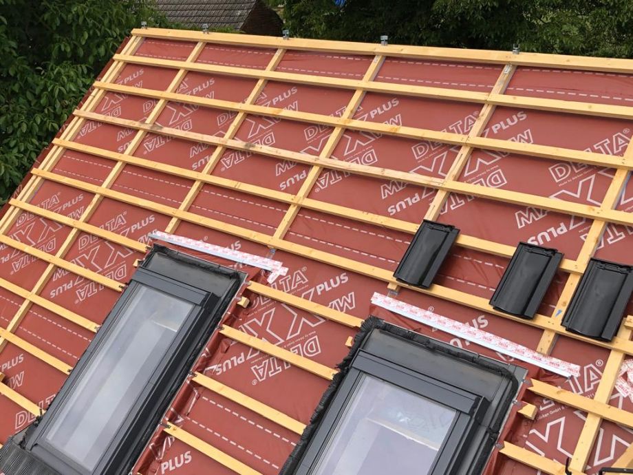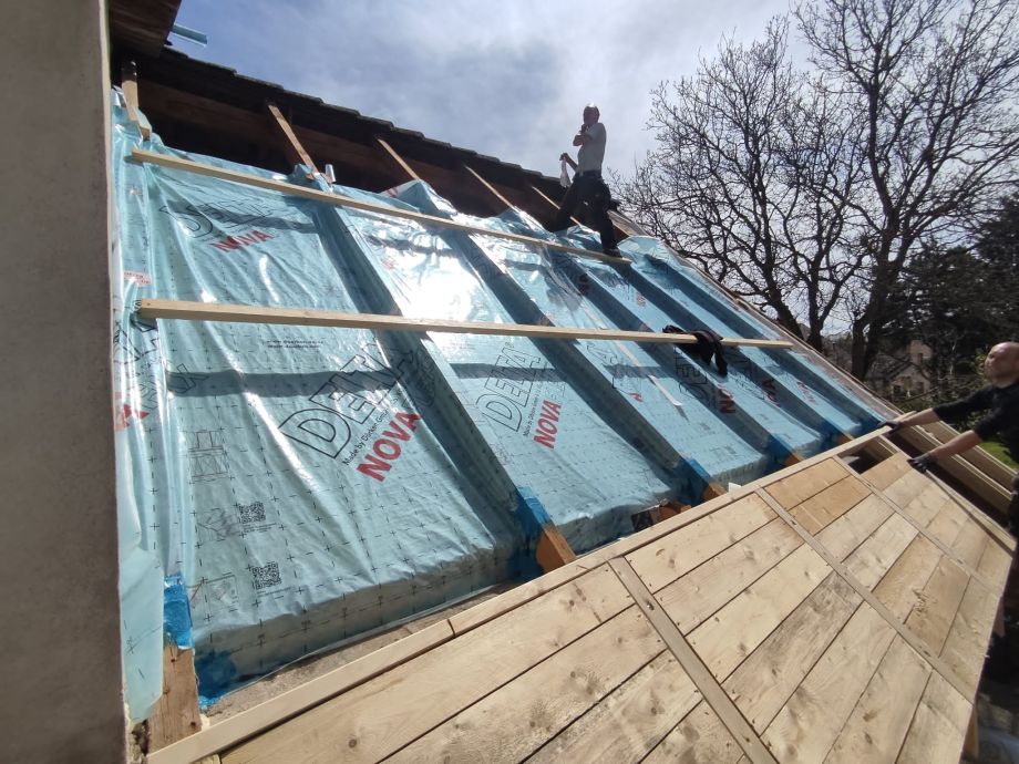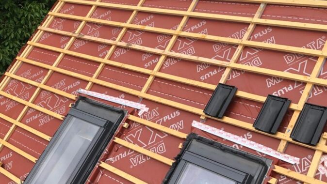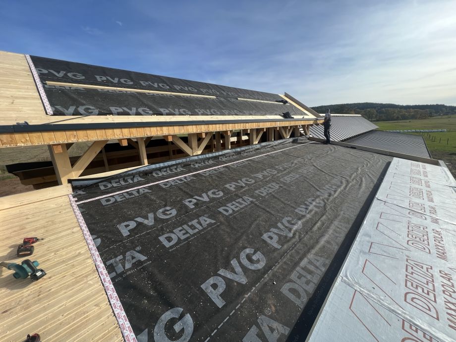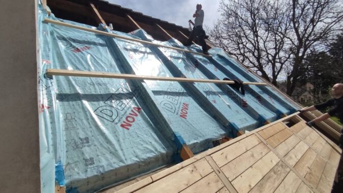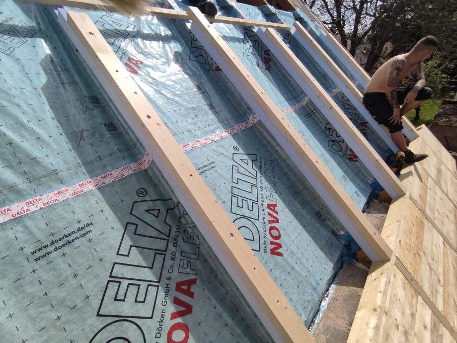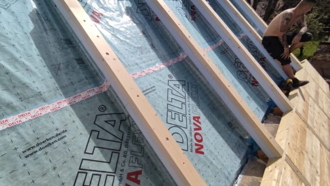 Pro účely sanace vedené z vnější strany vše v interiéru včetně obkladu zůstává beze změn. Není třeba se nikam stěhovat. Sanace parozábrany se provede z vnější strany pomocí parobrzdné fólie s proměnou difuzní propustností DELTA-NOVAFLEX, která umožňuje pokládku přes dřevěné krokevní prvky bez přerušení. Vzduchotěsné zpracování pomocí již zmíněných lepicích a těsnicích doplňků je i zde nezbytné. Vše je orientováno na maximální jednoduchost a účinnost provedení. Naším cílem jsou funkční střechy a ne „pouze“ prodaný materiál. Po vzduchotěsném zpracování parobrzdy pokračujeme v kompletaci ostatních vrstev střešního pláště až do finální podoby.