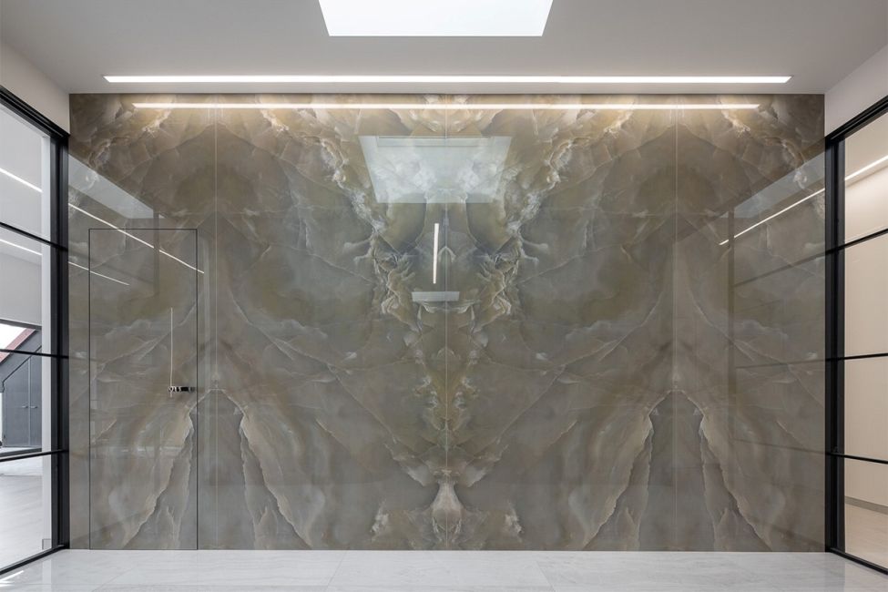 byl vybrán krásný onyx PERSIA, vzor bookmatch, jehož vzor se při vstupu rozevírá