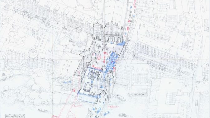 Štěpán: Byla to i deskriptivní geometrie. V určité fázi jsme si museli vybrat způsob promítání a úhel pohledu. Na hlavní objekty jsme použili pravítko, abychom si rozvrhli, jak vysoké udělat lidi, jak široký bude chodník. A potom už jsme pracovali poměrově. Část skupin využilo dostupný 3D model Prahy, pohledy z něj jsme si vytiskli a do kresby překreslili přes sklo.