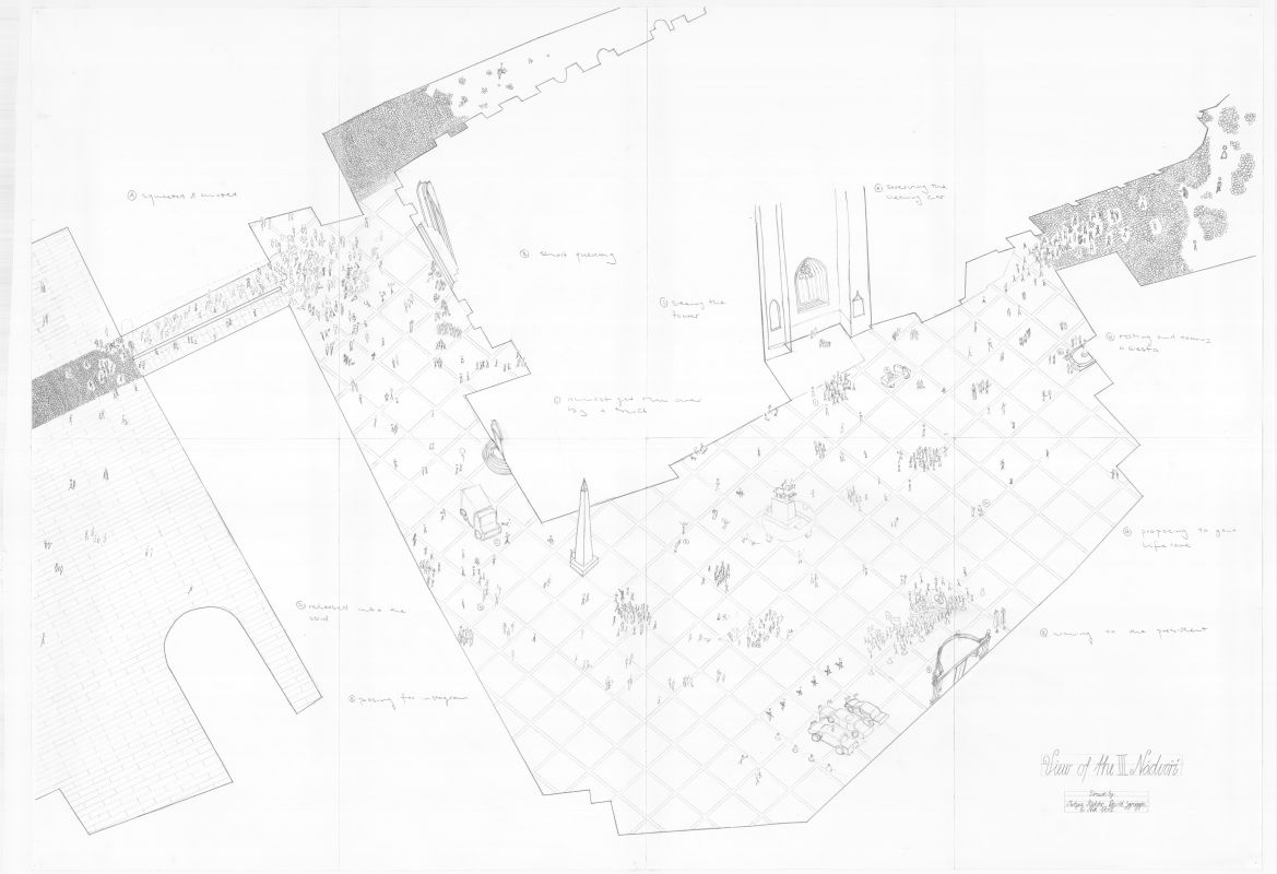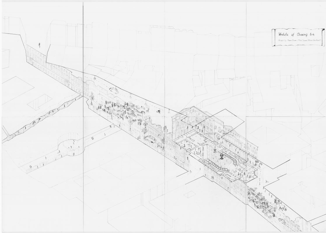 Mária: Ano, měli jsme pracovat mezi měřítky 1 : 200 až 1 : 800, to už bychom si ale museli obhájit, človíček se stává tečkou a aktivity těžko znázorníte. Jako jediní jsme zvolili pohled zdola, nedívali jsme se na náměstí z ptačí perspektivy, chtěli jsme totiž zvýraznit pražské pasáže, jinak ukryté v budovách.