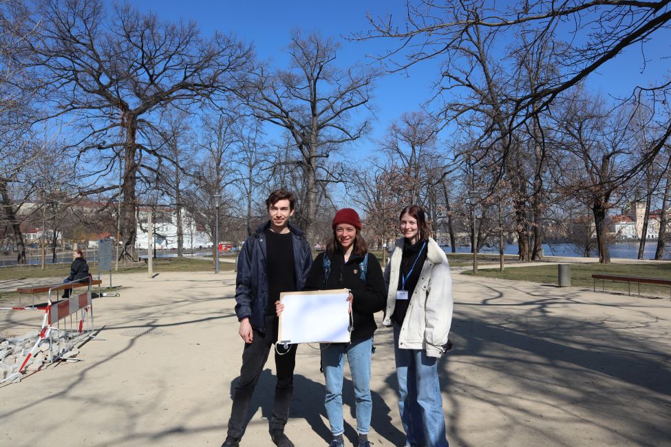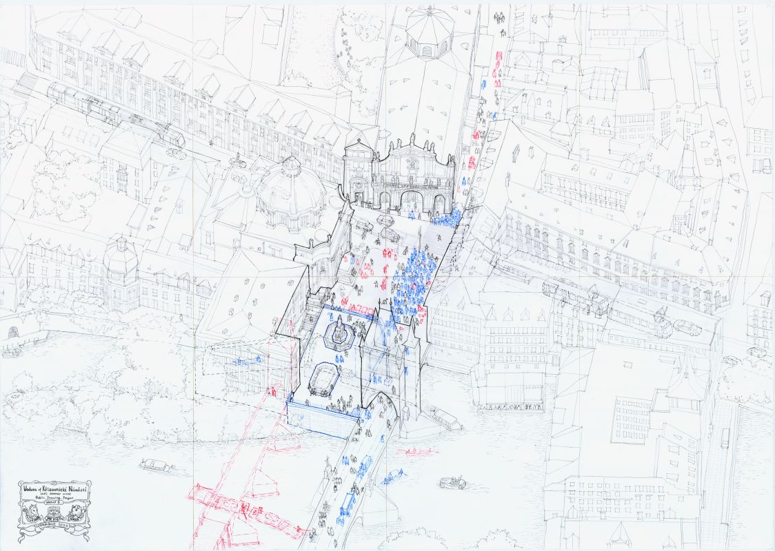 Štěpán: Byla to i deskriptivní geometrie. V určité fázi jsme si museli vybrat způsob promítání a úhel pohledu. Na hlavní objekty jsme použili pravítko, abychom si rozvrhli, jak vysoké udělat lidi, jak široký bude chodník. A potom už jsme pracovali poměrově. Část skupin využilo dostupný 3D model Prahy, pohledy z něj jsme si vytiskli a do kresby překreslili přes sklo.