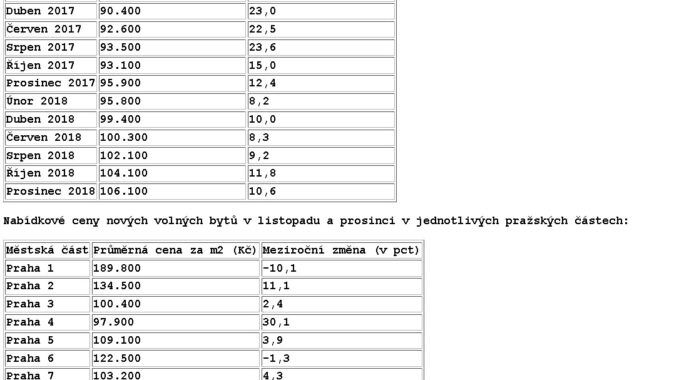 (ČTK) – Průměrná nabídková cena volných nových bytů v Praze na konci loňského roku meziročně vzrostla o 10,6 procenta na 106.100 korun za metr čtvereční. Tempo růstu je podobné jako před rokem, kdy byty meziročně zdražily o 12,4 procenta. Počet volných dostupných bytů v nabídce developerů na konci roku meziročně vzrostl více než o třetinu na 6114. Vyplývá to z údajů poradenské společnosti Deloitte, které má ČTK k dispozici.
