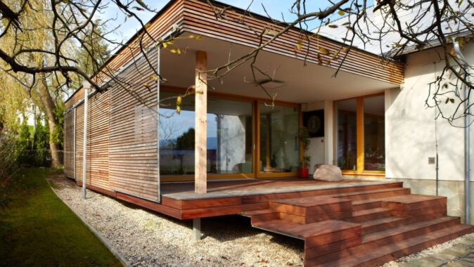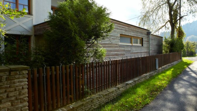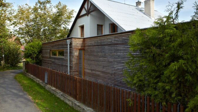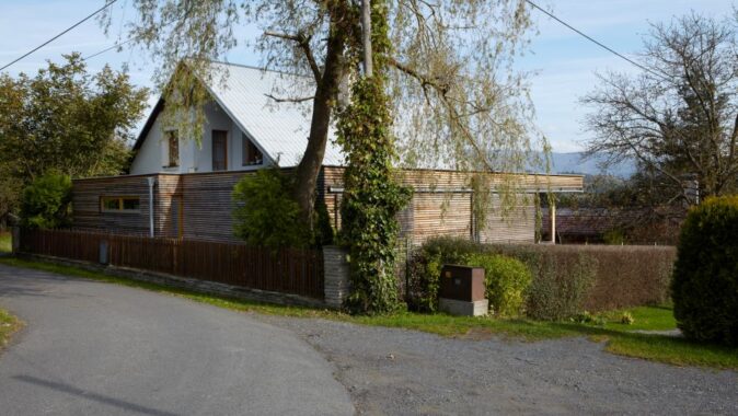 Přístavba je pojata jako difuzně otevřená jednopodlažní dřevostavba s rámovou konstrukcí na železobetonové monolitické desce, s plochým zastřešením a větranou fasádou z latí sibiřského modřínu. Stávající dům se tak rozrostl o nový, bohatě nasvětlený objem s panoramatickým výhledem do zahrady a vnitřního atria. Investor získal nejen nový obytný prostor, ale i pracovnu, soukromou galerii, knihovnu, hudební místnost, študovnu a dvě terasy.