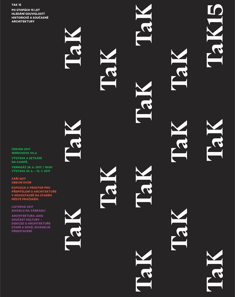 Architektonická a inženýrská kancelář TaK slaví 15 let výročí svého vzniku. Ve svém portfoliu má například rekonstrukci Werichovy vily, která se slavnostně otevře 16. června, novostavbu v Obecním dvoře v srdci Starého města či rekonstrukci divadla Na Zábradlí. K oslavám výročí připravila putovní výstavu. Poprvé ji můžete vidět ve Werichově vile od 29. června do 12. července 2017.