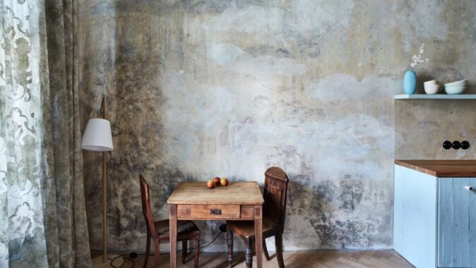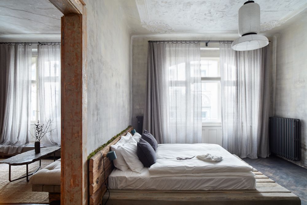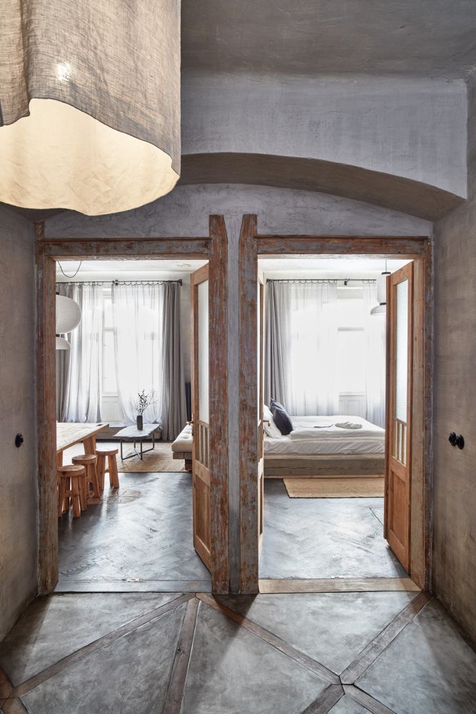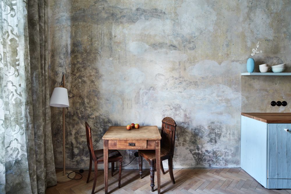částech, recyklované dřevo z podlah, historické vápenné omítky.