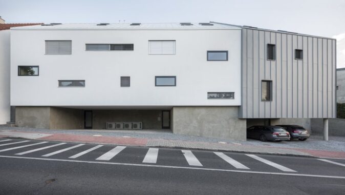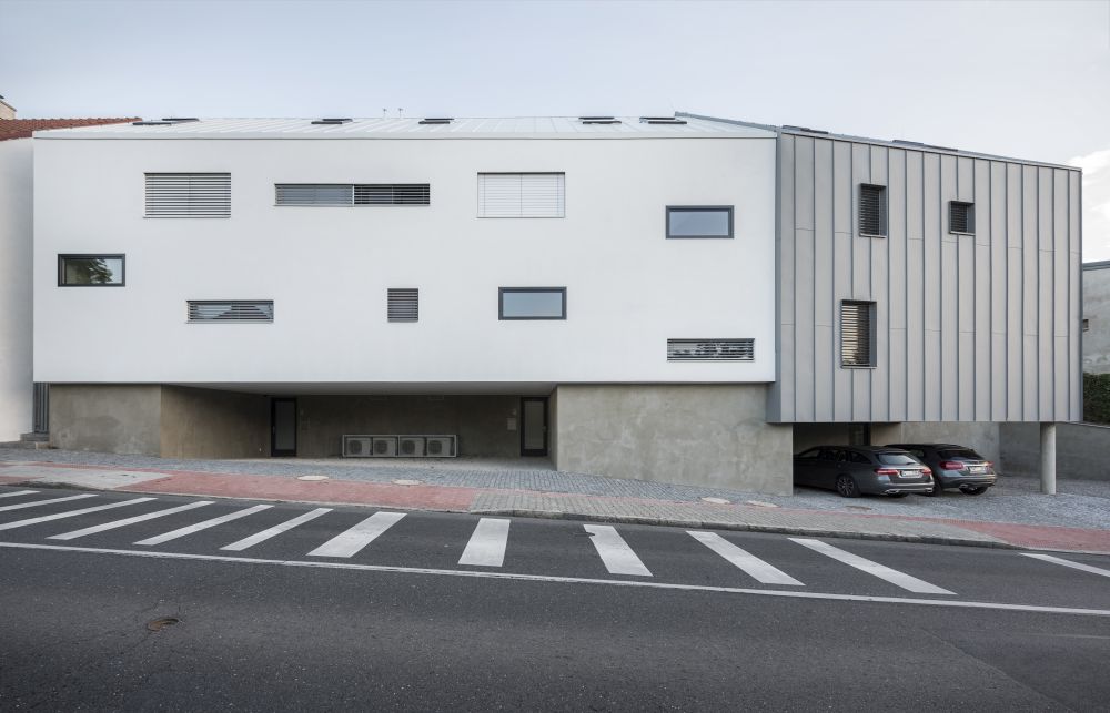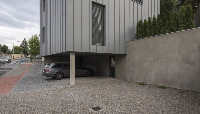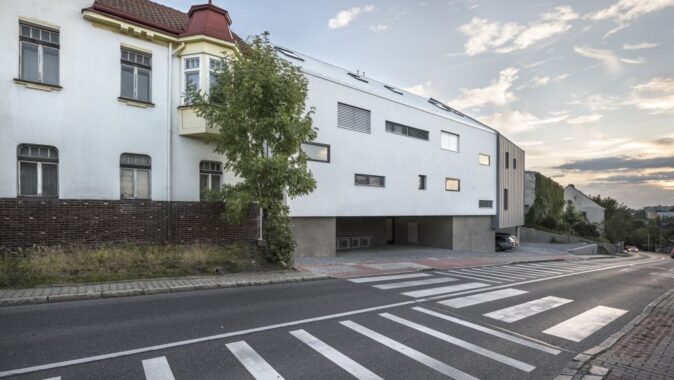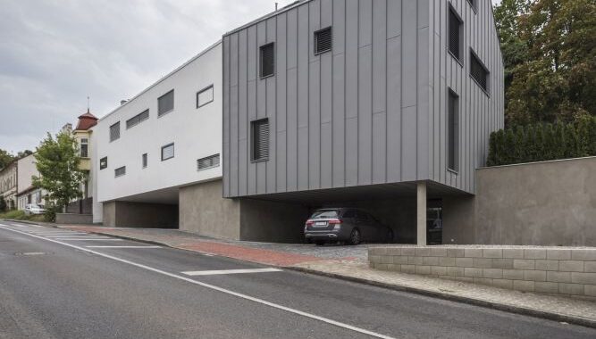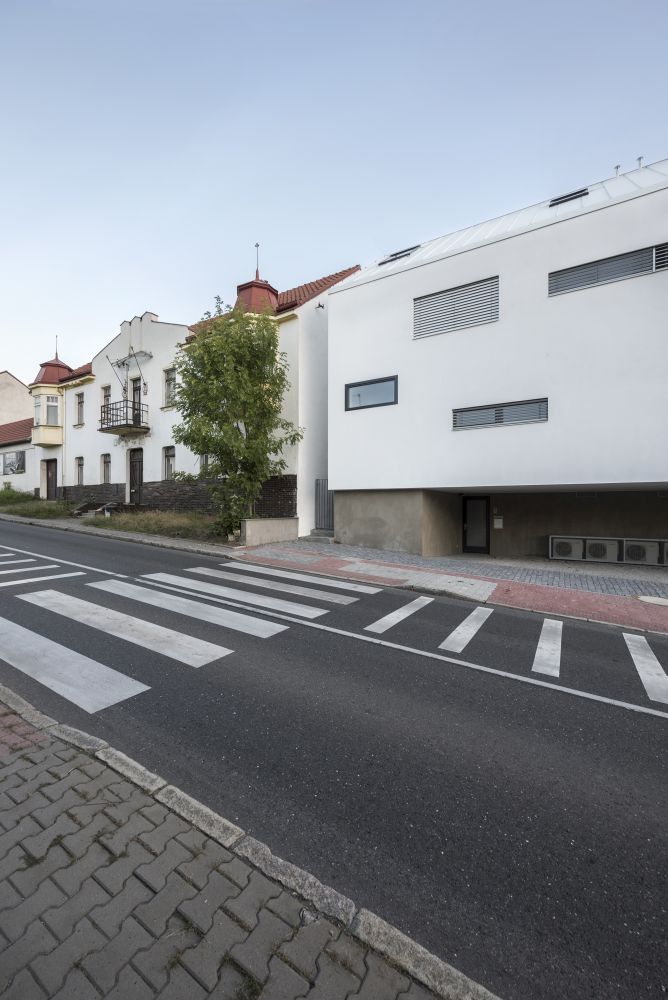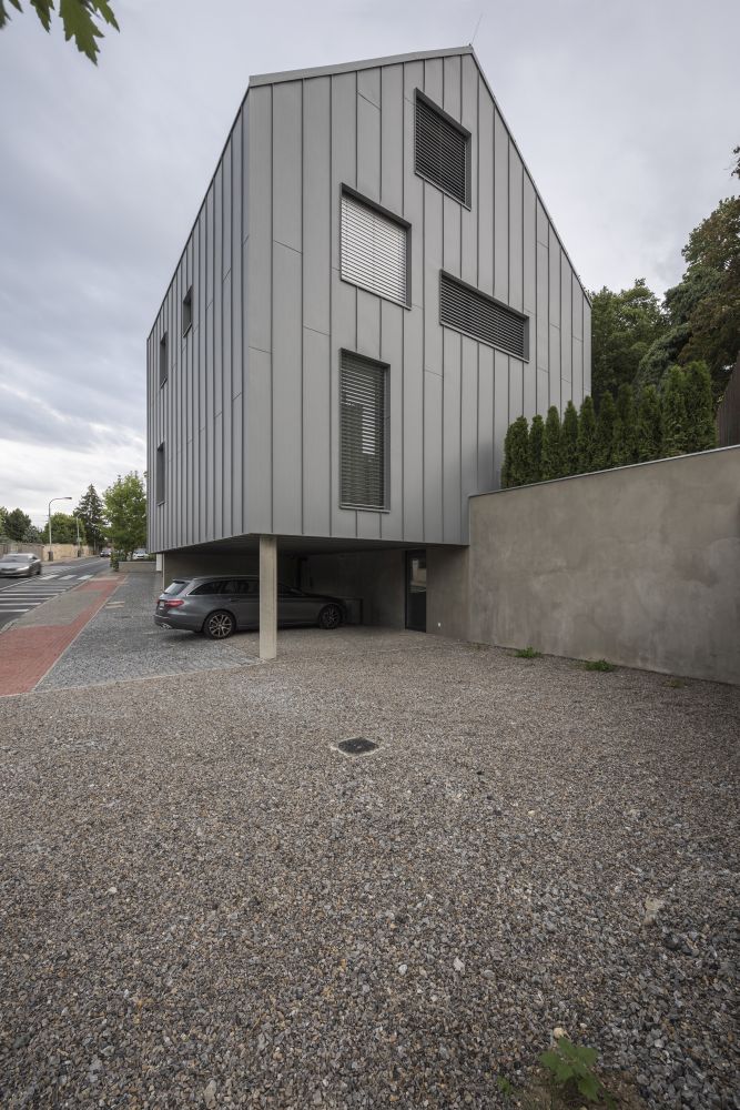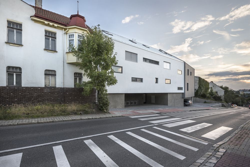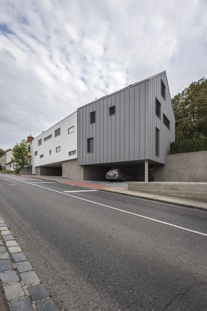 Soubor tří domů byl navržen jako jednoduchý objekt hmotově reflektující kontext, s tvarem i použitými materiály odvolávajícími se na tradiční architekturu, avšak použitými tak, aby došlo ke sjednocení stavby do prosté homogenní hmoty. Parter rytmizují dva bloky vstupních schodišť, jeho zbytek je ustoupen výrazně pod hlavní hmotu stavby. Opticky tedy stavba umožňuje rozšíření velmi stísněného uličního profilu, zároveň je ale pevně držena historická uliční čára, výška říms i hřebene. Veřejný parter je od soukromé zahrady oddělen výškově. Do rušné ulice na severní straně jsou v domě orientovány převážně servisní provozy, z čehož (spolu s energetickým konceptem) logicky plyne nižší fenestrace této fasády.