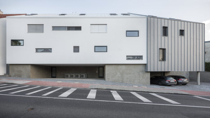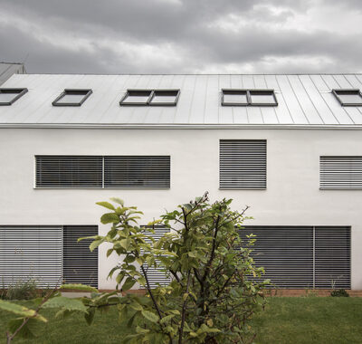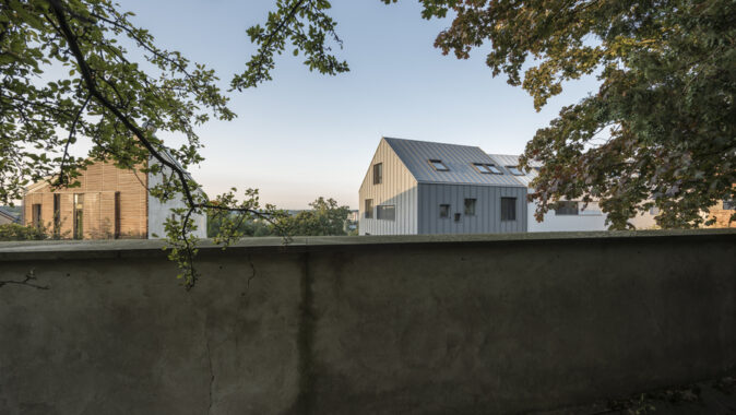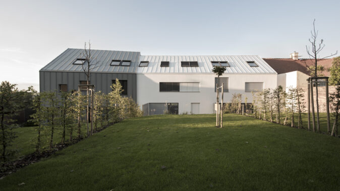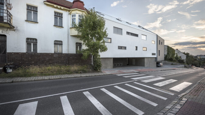Soubor tří rodinných domů byl navržen jako jednoduchý objekt hmotově reflektující kontext, s tvarem i materiály odvolávajícími se na tradiční architekturu, avšak použitými tak, aby došlo ke sjednocení stavby do prosté homogenní hmoty. Parter rytmizují dva bloky vstupních schodišť, jeho zbytek je ustoupen výrazně pod hlavní hmotu stavby. Opticky tedy stavba umožňuje rozšíření velmi stísněného uličního profilu, zároveň je ale pevně držena historická uliční čára, výška říms i hřebene. Veřejný parter je od soukromé zahrady oddělen výškově. Do rušné ulice na severní straně jsou v domě orientovány převážně servisní provozy, z čehož (spolu s energetickým konceptem) logicky plyne nižší fenestrace této fasády. Objekt je koncipován jako energeticky pasivní, vybavený tepelnými čerpadly vzduch-vzduch a nuceným větráním s rekuperací tepla.