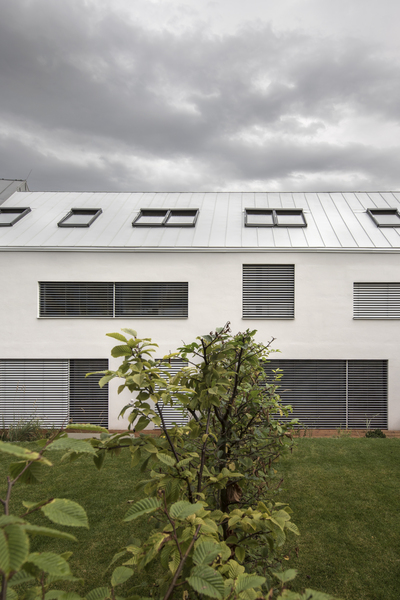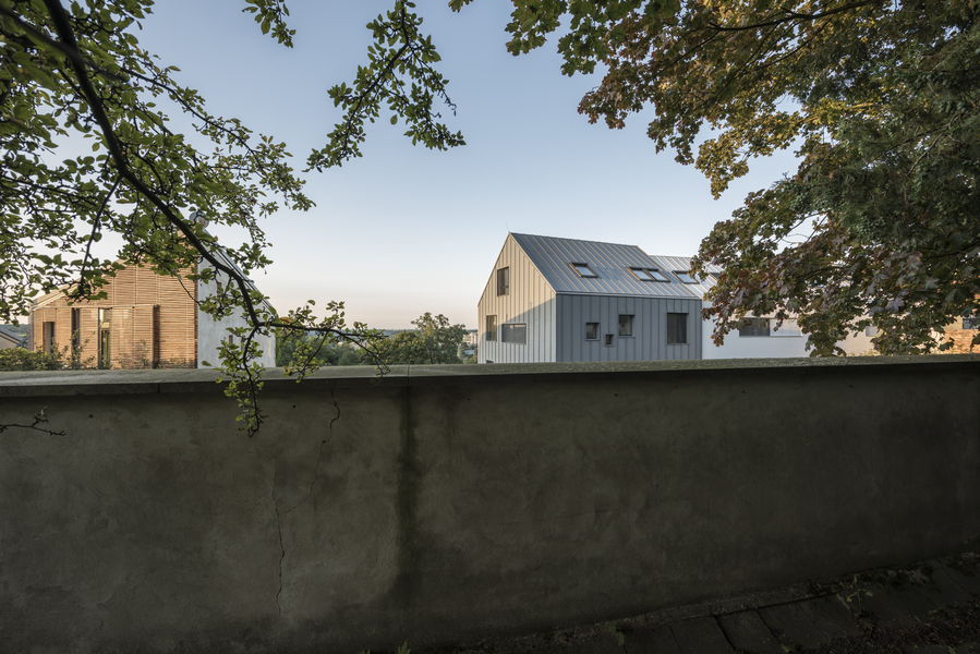 Soubor tří rodinných domů byl navržen jako jednoduchý objekt hmotově reflektující kontext, s tvarem i materiály odvolávajícími se na tradiční architekturu, avšak použitými tak, aby došlo ke sjednocení stavby do prosté homogenní hmoty. Parter rytmizují dva bloky vstupních schodišť, jeho zbytek je ustoupen výrazně pod hlavní hmotu stavby. Opticky tedy stavba umožňuje rozšíření velmi stísněného uličního profilu, zároveň je ale pevně držena historická uliční čára, výška říms i hřebene. Veřejný parter je od soukromé zahrady oddělen výškově. Do rušné ulice na severní straně jsou v domě orientovány převážně servisní provozy, z čehož (spolu s energetickým konceptem) logicky plyne nižší fenestrace této fasády. Objekt je koncipován jako energeticky pasivní, vybavený tepelnými čerpadly vzduch-vzduch a nuceným větráním s rekuperací tepla.