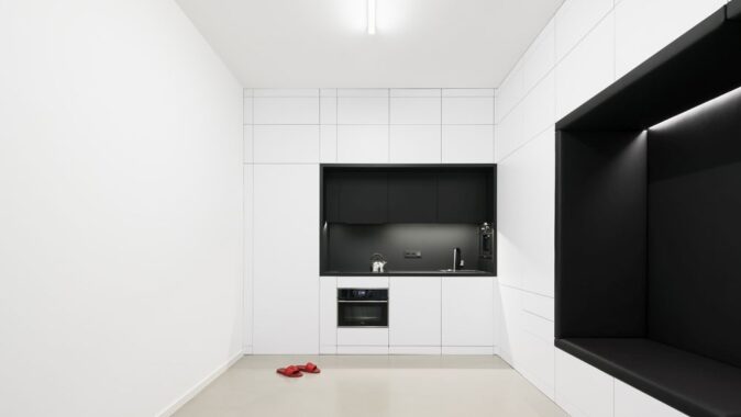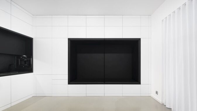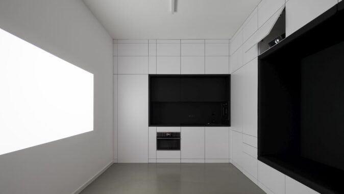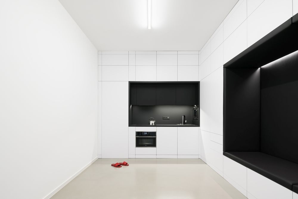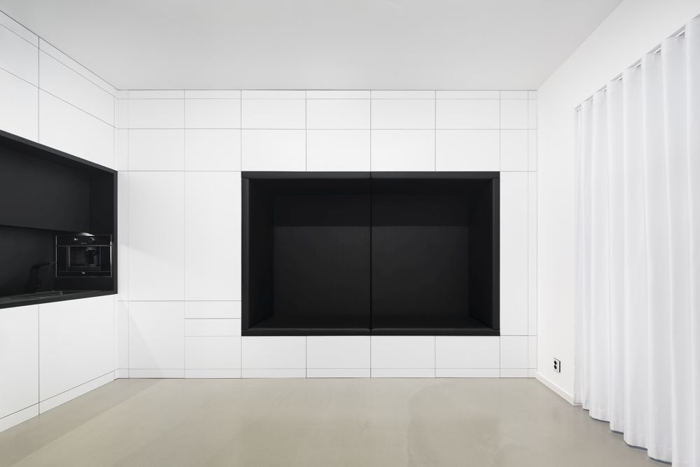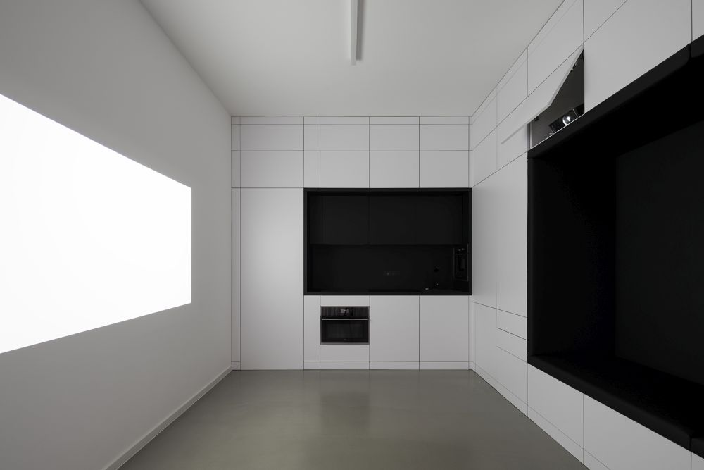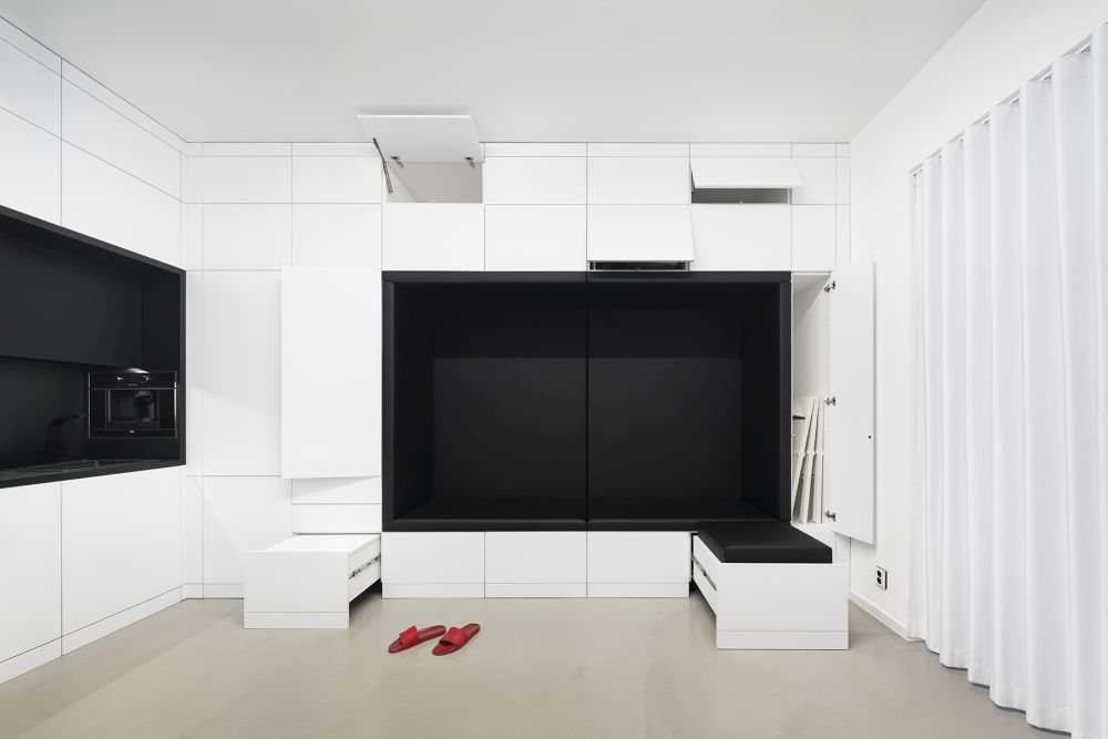 Vložený objem funguje jako neutrální pozadí a zároveň švýcarský nůž. Charakter a atmosféru prostoru přirozeně určuje právě probíhající činnost. Pokud se konkrétní aktivita zrovna neodehrává, zůstává skryta a zbytečně nezabírá nevelkou plochu. Světlé, hladké plochy maximalizují volný prostor. Prázdné objemy pohovky a kuchyně jsou s nimi záměrně v kontrastu. Prázdná stěna slouží jako promítací plátno.