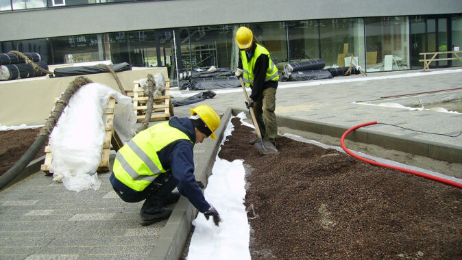 Realizace této střešní zahrady začala na podzim 2013. Celá plocha je vyspádována od středu do žlabů podél budov. Použitá hydroizolační fólie je odolná proti prorůstání kořenů. Odtok vody je zajištěn drenážní smyčkovou rohoží s oboustranně nakašírovanou filtrační textilií. Ta je položena pod všemi dlážděnými plochami, prochází pod obrubníky a sahá po okraj záhonů. V záhonech je na hydroizolaci položena ochranná geotextilie. Jako drenážní a vodoakumulační vrstva je použita nopová fólie Delta Floraxx Top tloušťky 20 mm (obr. 1). Aby substrát nemohl vnikat do drenážních cest, je styk drenážní smyčkoviny a nopové fólie na okrajích záhonů překrytý pruhem geotextilie (obr. 2). Vzhledem k velké mocnosti substrátu pro vzrostlé stromy byl jako spodní vrstva použit hrubší minerální substrát, který umožňuje kořenům stromů lépe dýchat a obsahuje jen malé množství organických součástí, takže nehrozí zahnívání kořenů. Jako vrchní vrstva o mocnosti cca 20–30 cm následoval intenzívní substrát s větším podílem organiky a živin, který je vhodným prostředím pro trávník i keře. Oba druhy substrátů (celkem cca 800 m3) byly na plochu dopraveny pneumaticky, vyfoukáním z cisteren (obr. 3). Celková mocnost substrátu v nejvyšších místech činí cca 80–90 cm. Modelace povrchu byla provedena tak, aby plocha tvořila dojem přirozeně zvlněného terénu v přírodě, bez vyumělkovaných pravidelností. Pro ukotvení stromů byly použity vždy dvě ocelové karisítě, položené na cca 20–30 cm spodního substrátu (obr. 4). Stromy jsou k nim kotveny za bal (obr. 5). Před návozem substrátu byl rovněž položen páteřní rozvod závlahového systému. Protože zima 2013/14 byla nezvykle teplá a suchá a závlahy ještě nebyly dokončené a v provozu, bylo nutné čerstvě vysazené červené javory alespoň dvakrát vydatně zalít.
