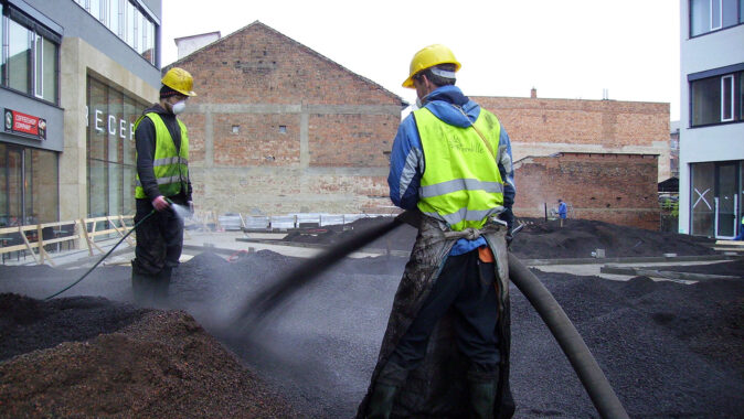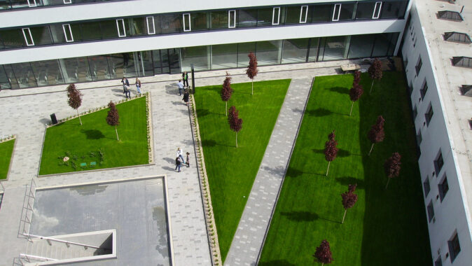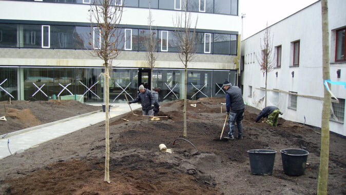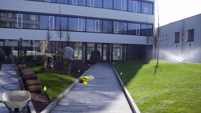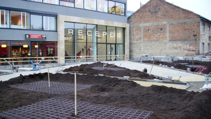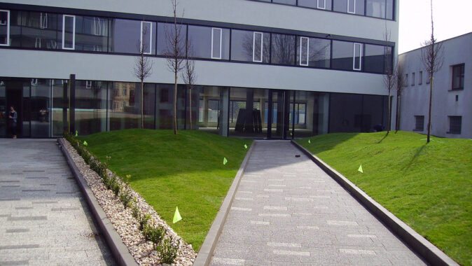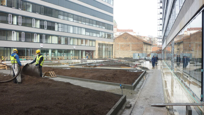 Přímo na DELTA-FLORAXX TOP byl uložen substrát, o jehož dopravu na místo se postaralo mobilní silo a flexibilní tlakové potrubí. Po požadovaném rozvrstvení a vymodelování plánovaných terénních nerovností a instalaci zavlažovacího systému následovala pokládka travních koberců a výsadba intenzivní zeleně. Fólie DELTA-FLORAXX TOP tak přispěla k maximálně rychlému, principiálně jednoduchému a spolehlivě funkčnímu způsobu ekologického zušlechtění atria administrativního komplexu Titanium. Realizaci provedla firma Greenville Brno.