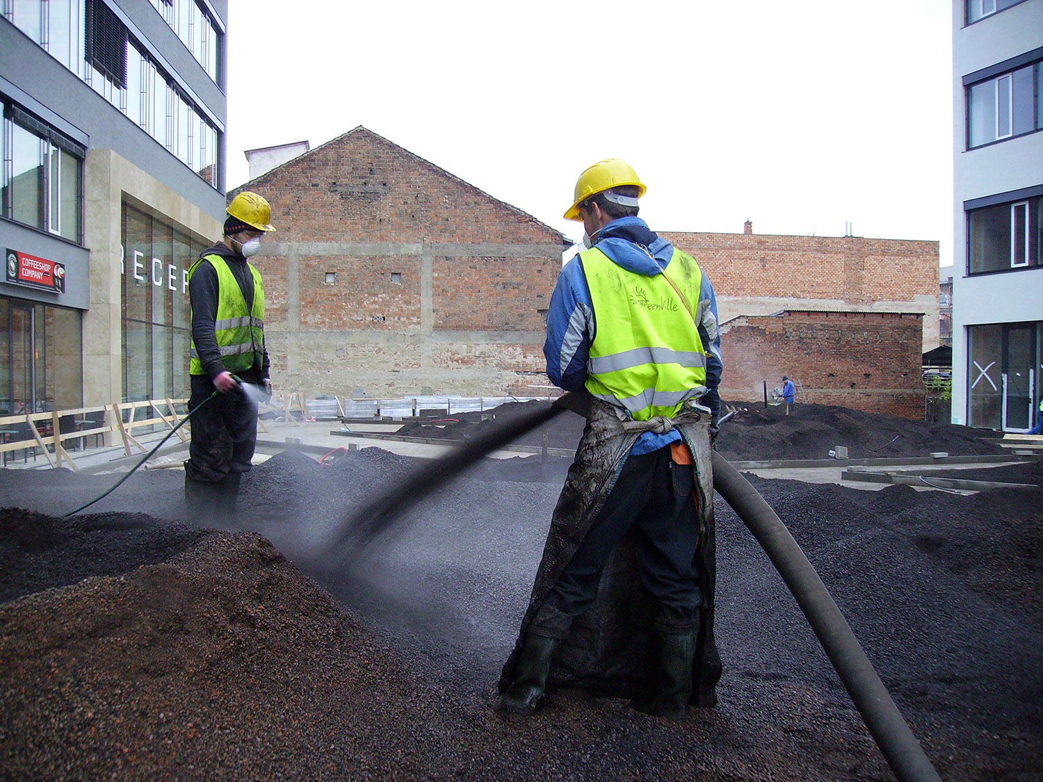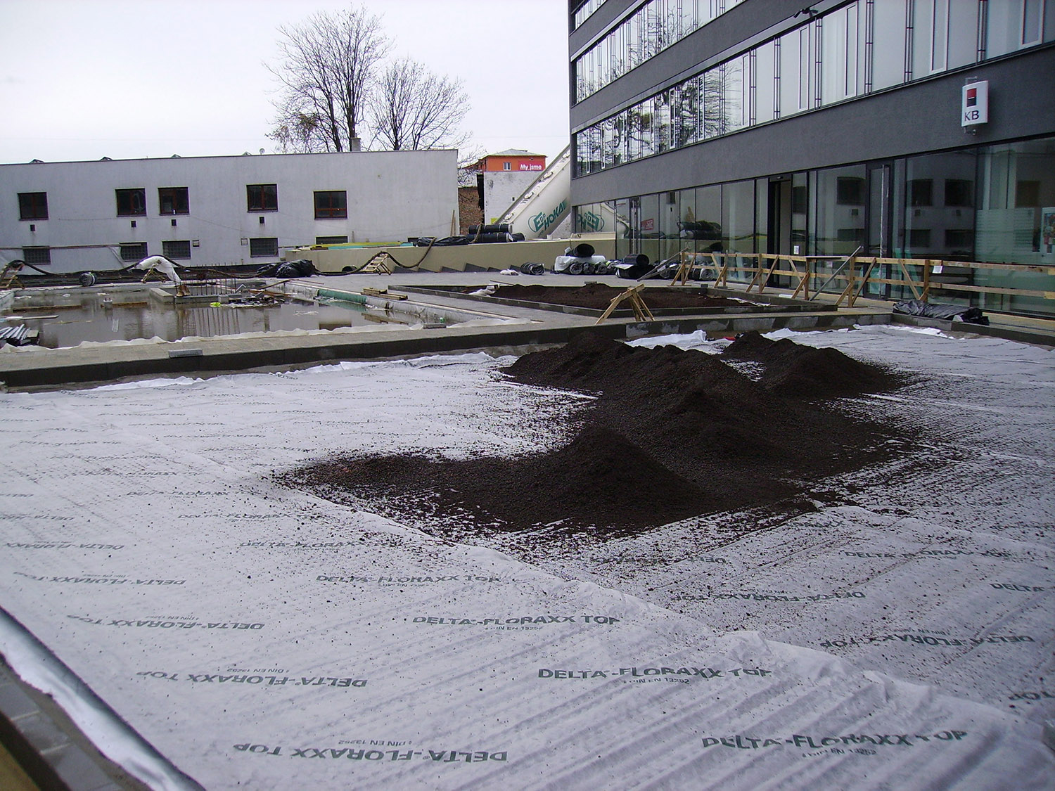 Přímo na DELTA-FLORAXX TOP byl uložen substrát, o jehož dopravu na místo se postaralo mobilní silo a flexibilní tlakové potrubí. Po požadovaném rozvrstvení a vymodelování plánovaných terénních nerovností a instalaci zavlažovacího systému následovala pokládka travních koberců a výsadba intenzivní zeleně. Fólie DELTA-FLORAXX TOP tak přispěla k maximálně rychlému, principiálně jednoduchému a spolehlivě funkčnímu způsobu ekologického zušlechtění atria administrativního komplexu Titanium. Realizaci provedla firma Greenville Brno.