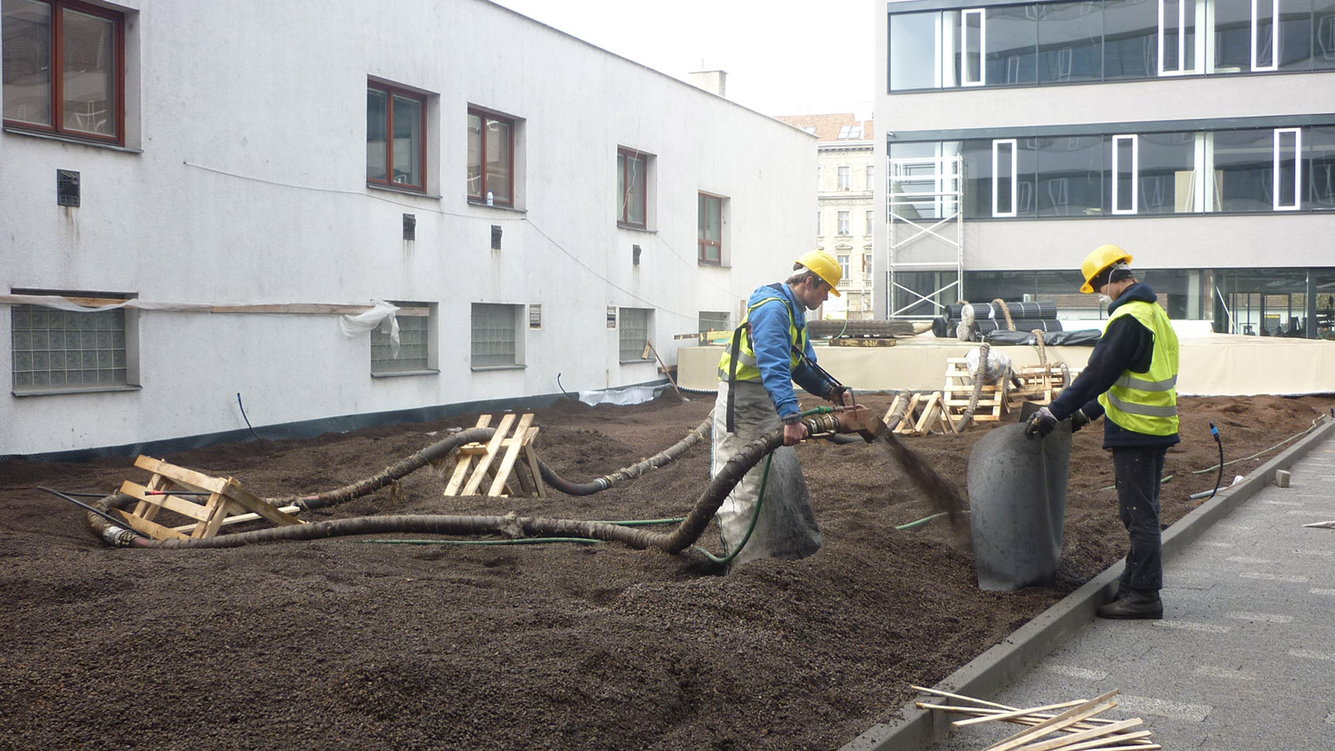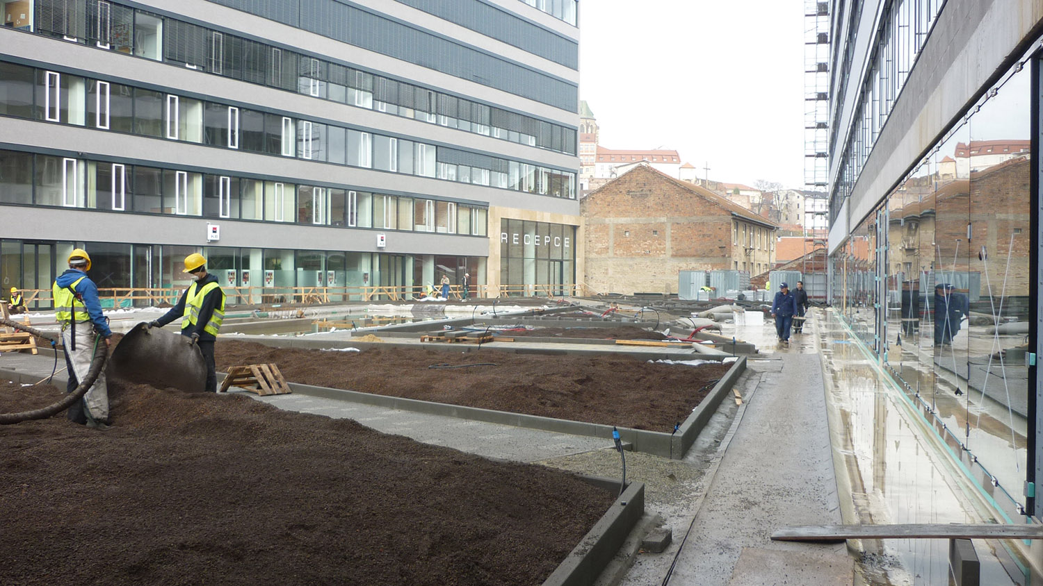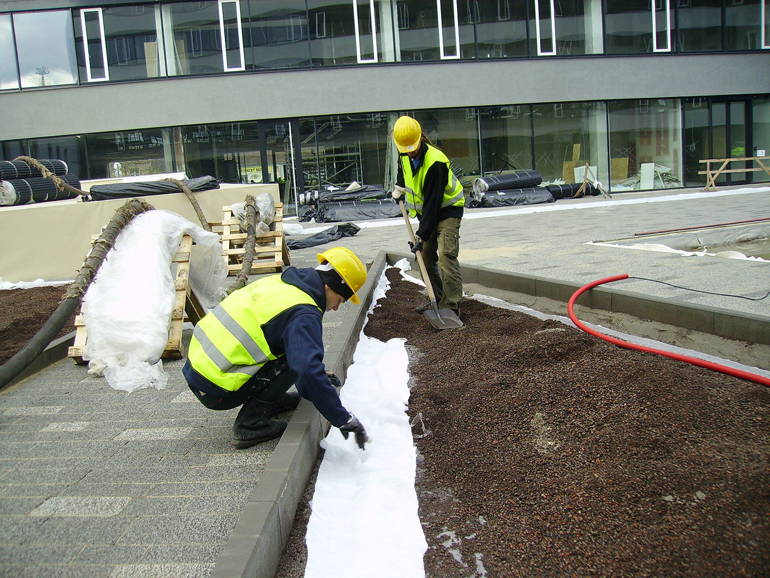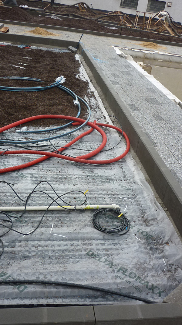 Realizace této střešní zahrady začala na podzim 2013. Celá plocha je vyspádována od středu do žlabů podél budov. Použitá hydroizolační fólie je odolná proti prorůstání kořenů. Odtok vody je zajištěn drenážní smyčkovou rohoží s oboustranně nakašírovanou filtrační textilií. Ta je položena pod všemi dlážděnými plochami, prochází pod obrubníky a sahá po okraj záhonů. V záhonech je na hydroizolaci položena ochranná geotextilie. Jako drenážní a vodoakumulační vrstva je použita nopová fólie Delta Floraxx Top tloušťky 20 mm (obr. 1). Aby substrát nemohl vnikat do drenážních cest, je styk drenážní smyčkoviny a nopové fólie na okrajích záhonů překrytý pruhem geotextilie (obr. 2). Vzhledem k velké mocnosti substrátu pro vzrostlé stromy byl jako spodní vrstva použit hrubší minerální substrát, který umožňuje kořenům stromů lépe dýchat a obsahuje jen malé množství organických součástí, takže nehrozí zahnívání kořenů. Jako vrchní vrstva o mocnosti cca 20–30 cm následoval intenzívní substrát s větším podílem organiky a živin, který je vhodným prostředím pro trávník i keře. Oba druhy substrátů (celkem cca 800 m3) byly na plochu dopraveny pneumaticky, vyfoukáním z cisteren (obr. 3). Celková mocnost substrátu v nejvyšších místech činí cca 80–90 cm. Modelace povrchu byla provedena tak, aby plocha tvořila dojem přirozeně zvlněného terénu v přírodě, bez vyumělkovaných pravidelností. Pro ukotvení stromů byly použity vždy dvě ocelové karisítě, položené na cca 20–30 cm spodního substrátu (obr. 4). Stromy jsou k nim kotveny za bal (obr. 5). Před návozem substrátu byl rovněž položen páteřní rozvod závlahového systému. Protože zima 2013/14 byla nezvykle teplá a suchá a závlahy ještě nebyly dokončené a v provozu, bylo nutné čerstvě vysazené červené javory alespoň dvakrát vydatně zalít.