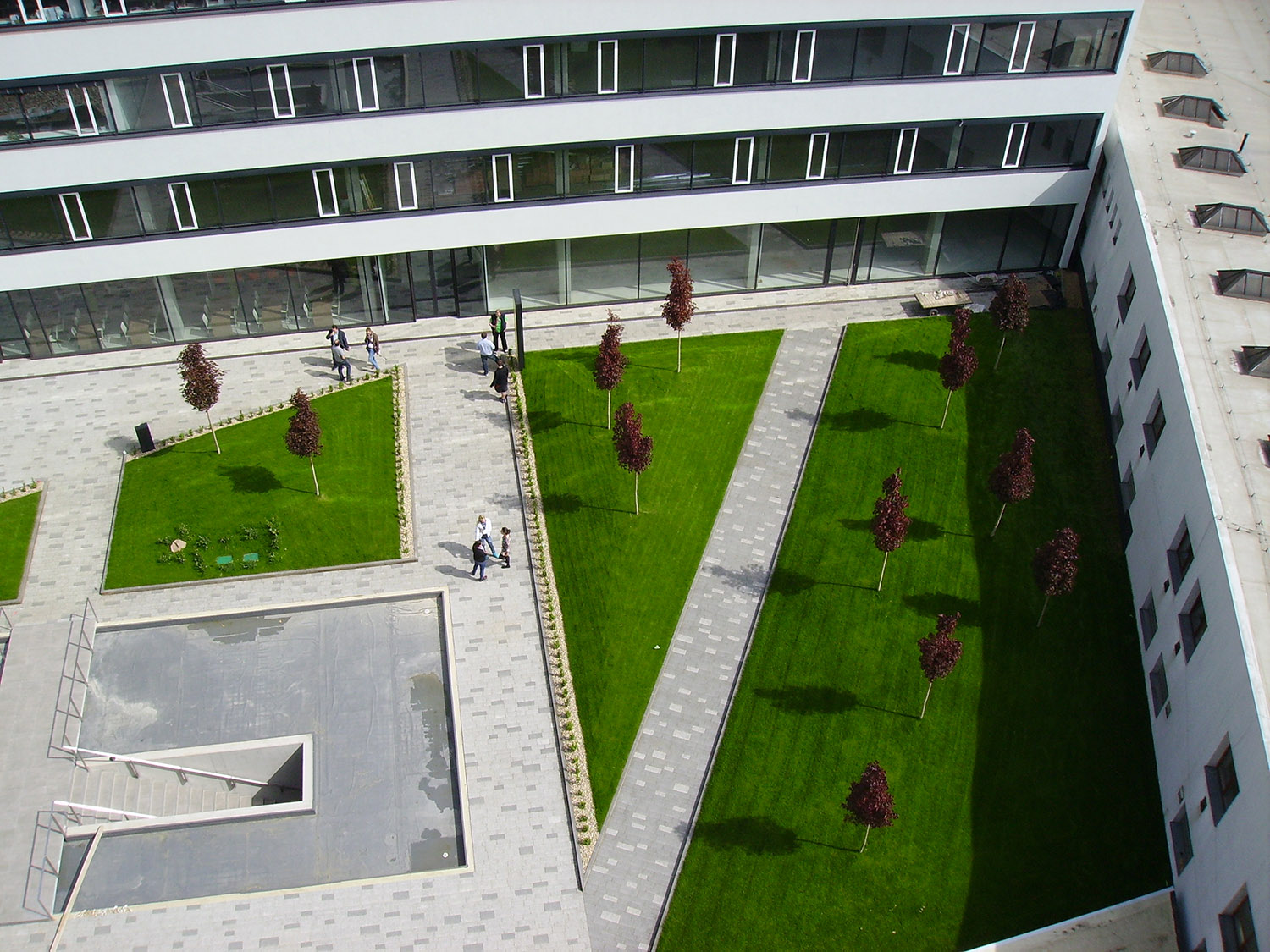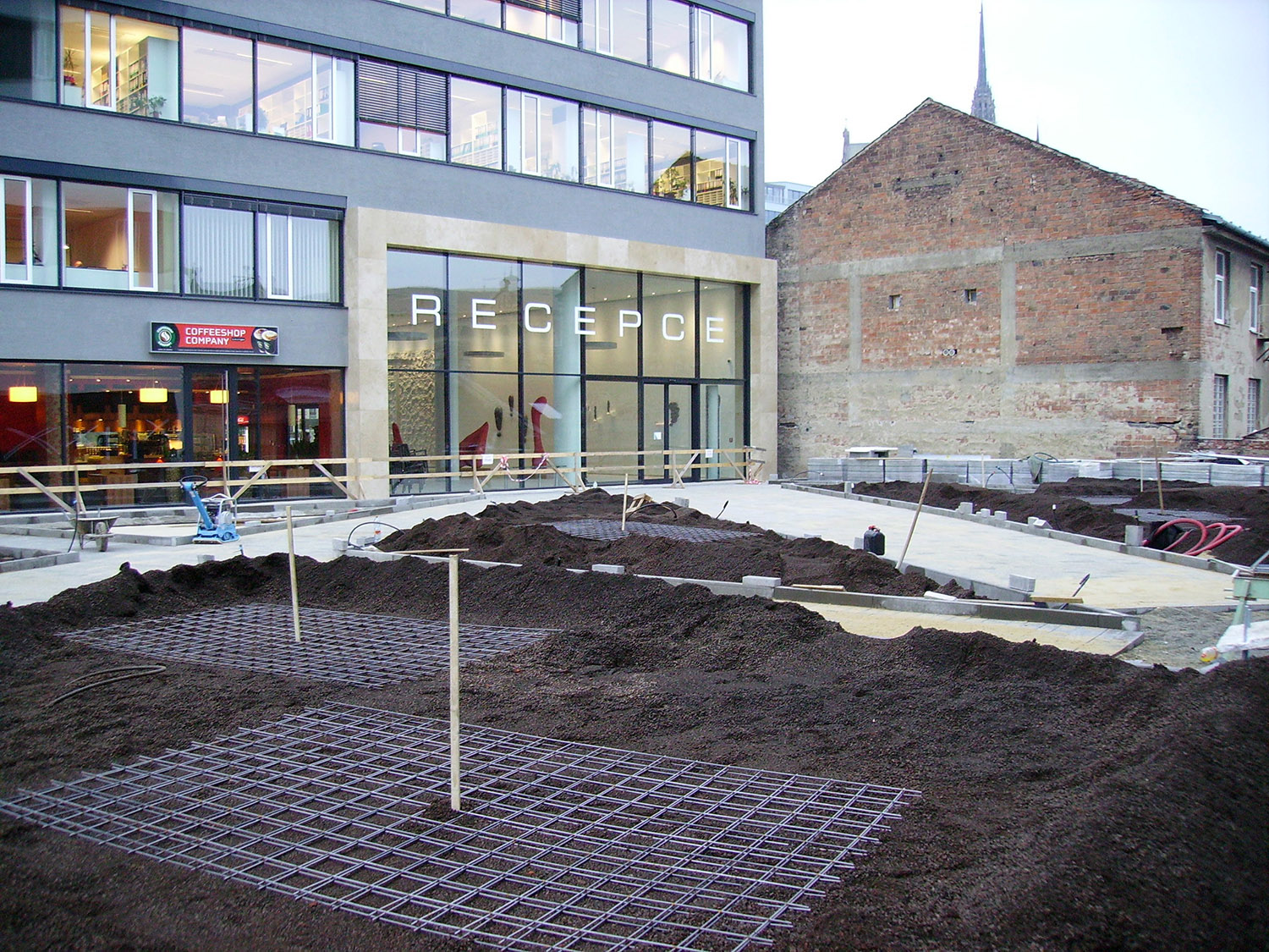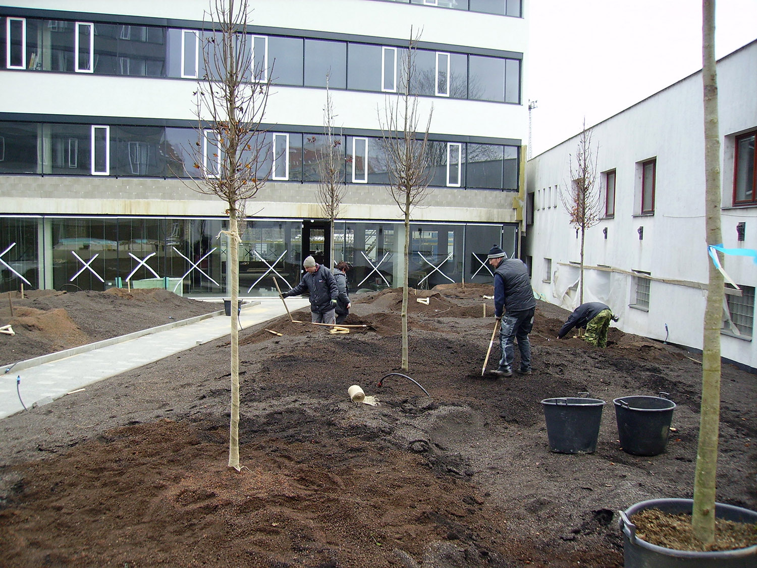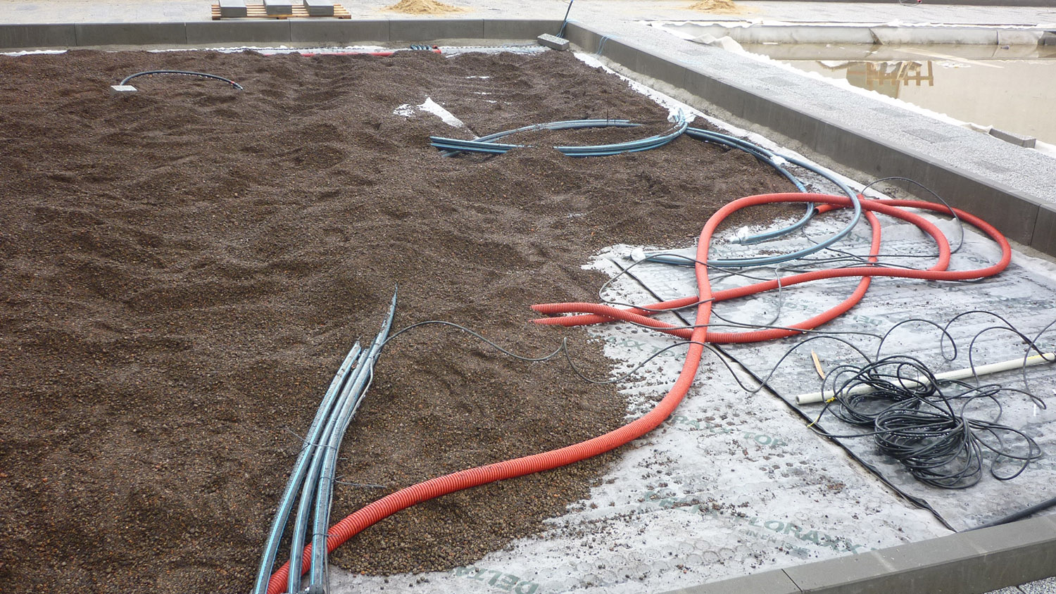 Realizace této střešní zahrady začala na podzim 2013. Celá plocha je vyspádována od středu do žlabů podél budov. Použitá hydroizolační fólie je odolná proti prorůstání kořenů. Odtok vody je zajištěn drenážní smyčkovou rohoží s oboustranně nakašírovanou filtrační textilií. Ta je položena pod všemi dlážděnými plochami, prochází pod obrubníky a sahá po okraj záhonů. V záhonech je na hydroizolaci položena ochranná geotextilie. Jako drenážní a vodoakumulační vrstva je použita nopová fólie Delta Floraxx Top tloušťky 20 mm (obr. 1). Aby substrát nemohl vnikat do drenážních cest, je styk drenážní smyčkoviny a nopové fólie na okrajích záhonů překrytý pruhem geotextilie (obr. 2). Vzhledem k velké mocnosti substrátu pro vzrostlé stromy byl jako spodní vrstva použit hrubší minerální substrát, který umožňuje kořenům stromů lépe dýchat a obsahuje jen malé množství organických součástí, takže nehrozí zahnívání kořenů. Jako vrchní vrstva o mocnosti cca 20–30 cm následoval intenzívní substrát s větším podílem organiky a živin, který je vhodným prostředím pro trávník i keře. Oba druhy substrátů (celkem cca 800 m3) byly na plochu dopraveny pneumaticky, vyfoukáním z cisteren (obr. 3). Celková mocnost substrátu v nejvyšších místech činí cca 80–90 cm. Modelace povrchu byla provedena tak, aby plocha tvořila dojem přirozeně zvlněného terénu v přírodě, bez vyumělkovaných pravidelností. Pro ukotvení stromů byly použity vždy dvě ocelové karisítě, položené na cca 20–30 cm spodního substrátu (obr. 4). Stromy jsou k nim kotveny za bal (obr. 5). Před návozem substrátu byl rovněž položen páteřní rozvod závlahového systému. Protože zima 2013/14 byla nezvykle teplá a suchá a závlahy ještě nebyly dokončené a v provozu, bylo nutné čerstvě vysazené červené javory alespoň dvakrát vydatně zalít.