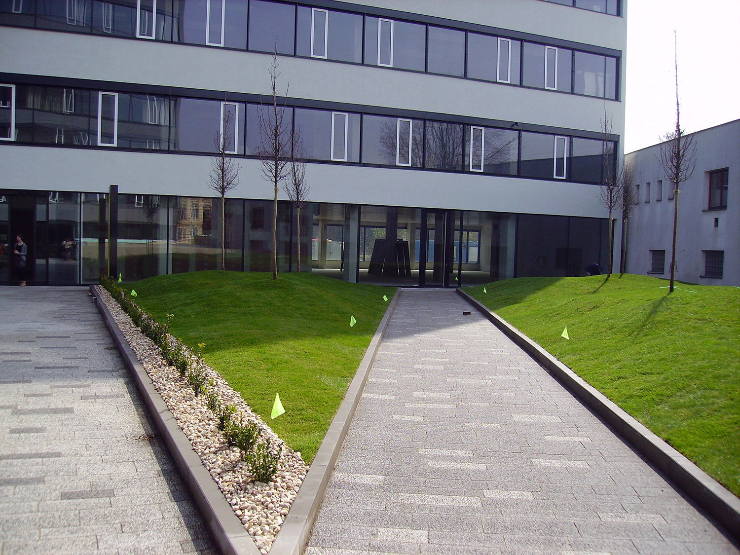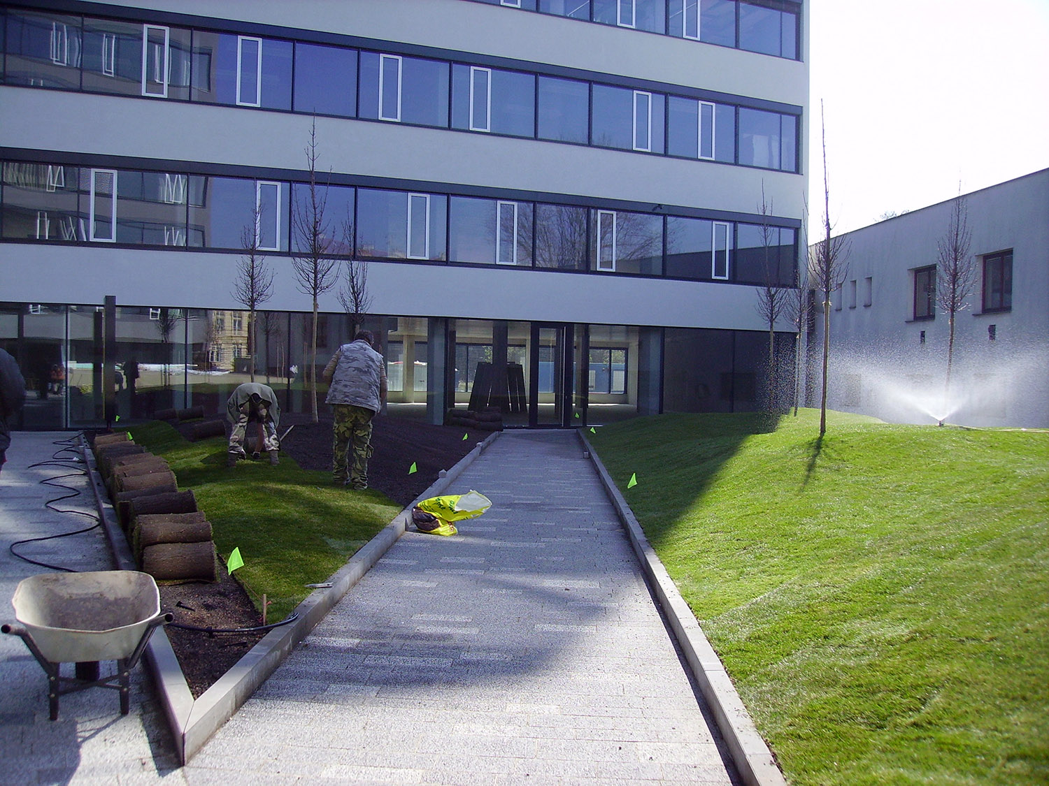 Na jaře 2014 byl dokončen automatický závlahový systém, položen kobercový trávník, vysazeny buxusy a přísavníky (obr. 6, obr. 7). Kvůli nedostatečnému tlaku vody z vodovodního řadu bylo nakonec rozhodnuto, že voda pro závlahy se bude čerpat samostatným čerpadlem z okrasného mělkého bazénku uprostřed parku. Tím se zároveň vyřešil problém udržení čistoty vody v bazénku, která se díky neustálé obměně nestačí zkalit. Navíc je předehřátá a odražená, což vegetaci prospívá. A to, že investor ušetří na čisticí chemii, už je bonus navíc.