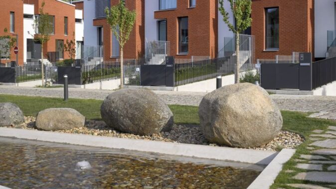 Klíčovým principem urbanistického řešení bylo vytvoření velkého poloveřejného parku, který je v rezidenci umístěn centrálně a prostorově se vztahuje ke komínu bývalé cihelny. Rezidenční prostor má venkovský ráz, obyvatelé zde mohou odpočívat nebo sportovat. Komín v rohu městského parteru je součástí konstrukce společné klubovny, kde je možné posedět uvnitř i na otevřené verandě. Ke klubovně přiléhá jezírko. V rezidenčním areálu jsou velké balvany a lichoběžníkové segmenty drátěných klecí prorostlých zelení. Část vzrostlých stromů tvoří malé hájky, které vyrůstají z malých travnatých kopců. Na společnou zeleň navazují soukromé prostory domů, zahrádek a předzahrádek. Ulice mají rezidenční charakter. Součástí areálu je i dětské hřiště, multifunkční plocha a hřiště na pétanque.