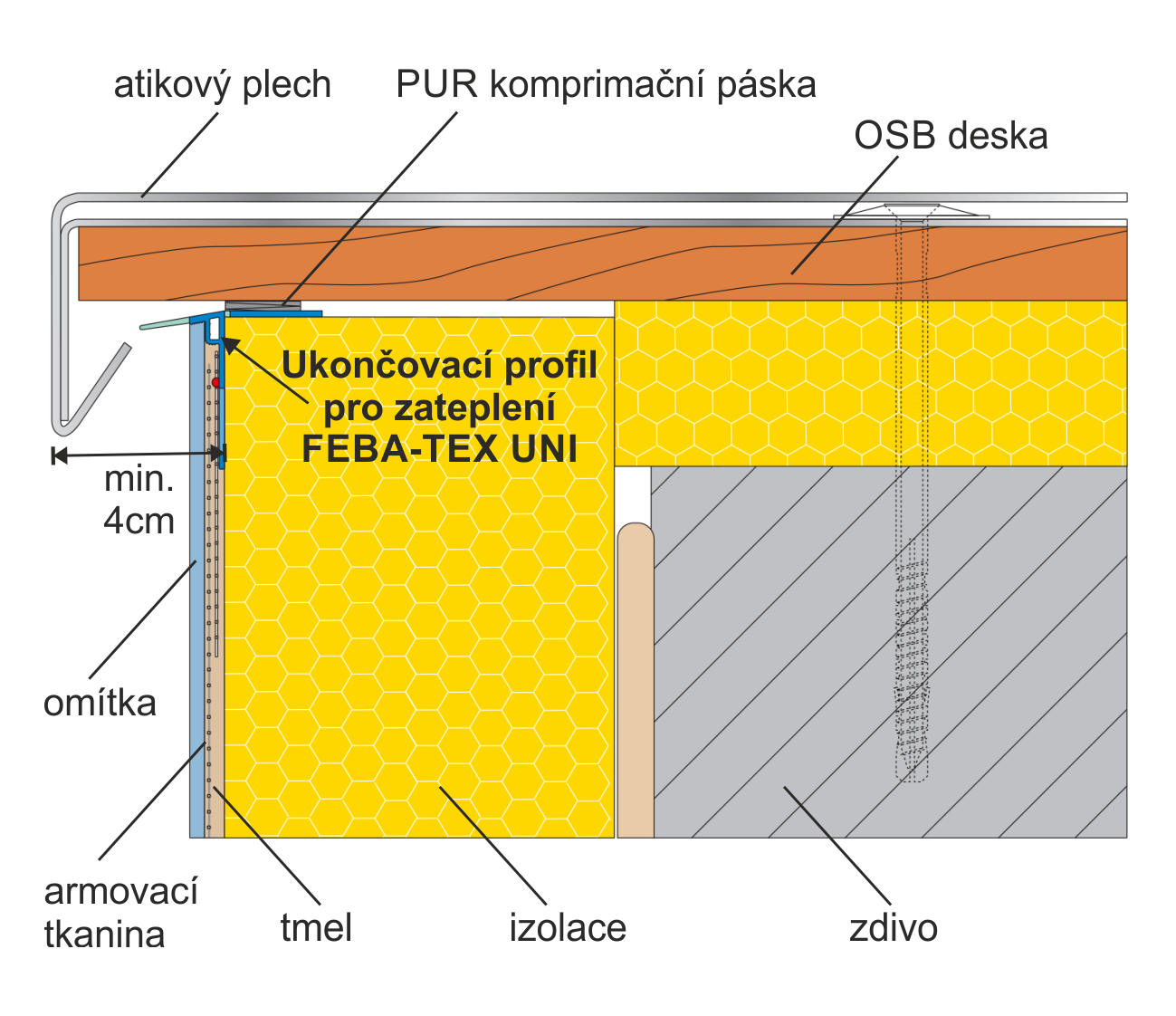 zateplení FEBA-TEX UNI, zajistí napojení ETICS k atikovému plechu. Toto řešení poskytuje ochranu