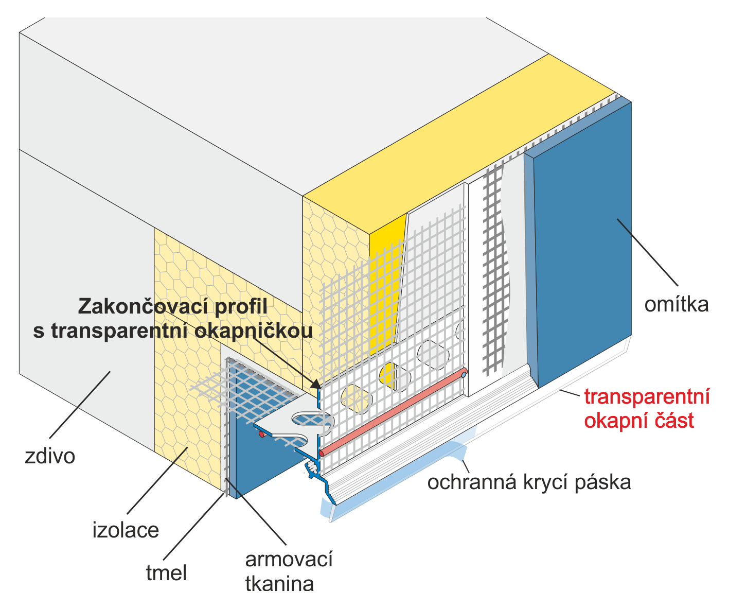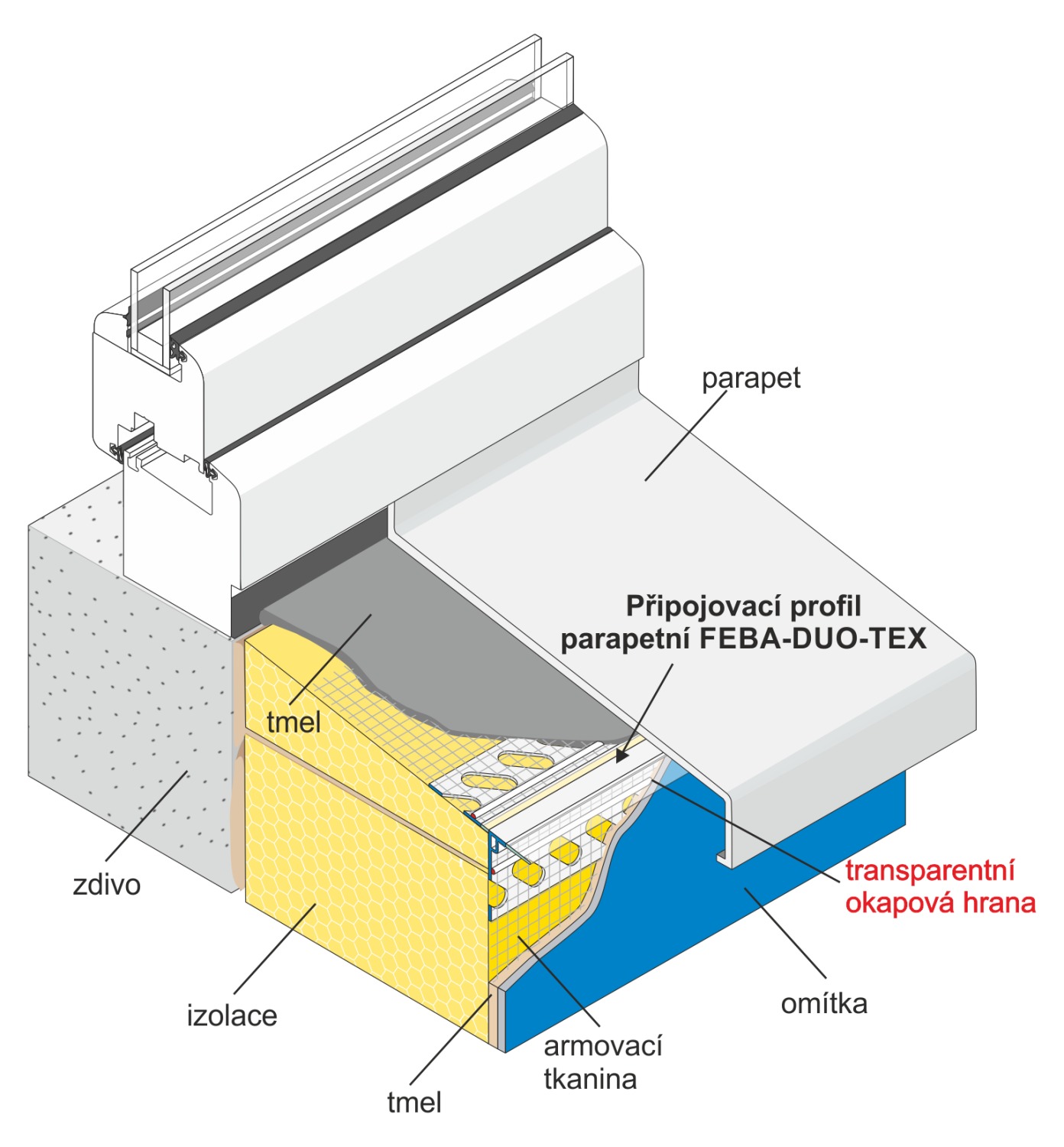 okapovou hranou. Profil zajišťuje jednoduché napojení parapetu v různých