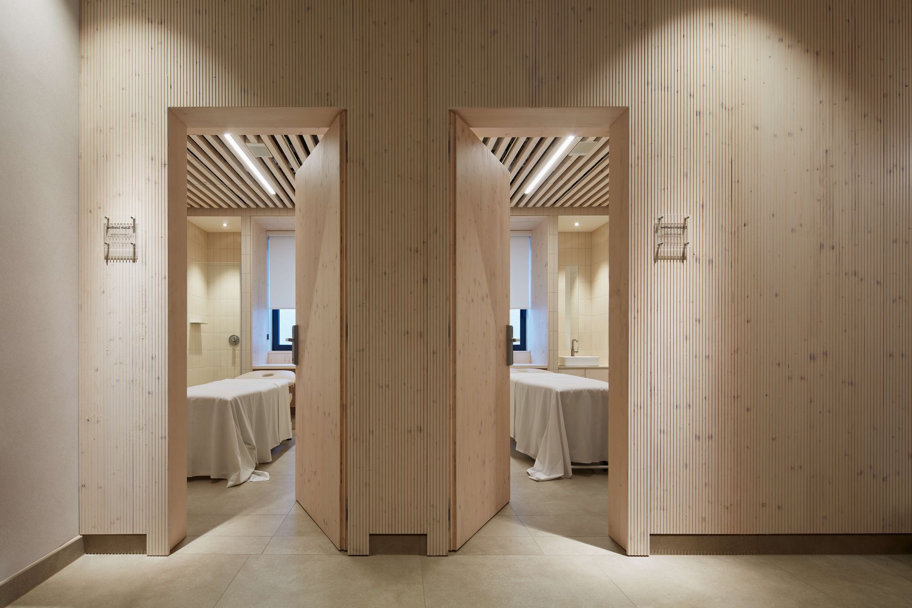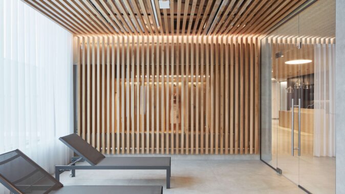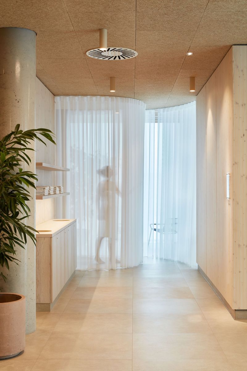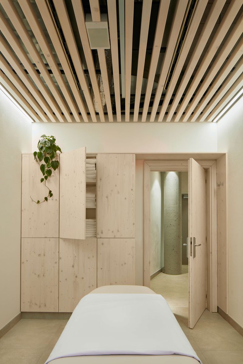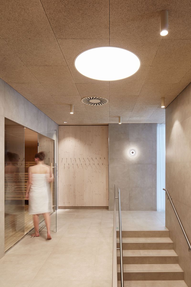 Budovou procházejí podhledy z Heradesignu různých barev a systémů zavěšení, zajišťující akustickou i estetickou pohodu. Masérny jsou vybaveny vestavěnými truhlářskými prvky ze smrkové biodesky. Světla materiálově navazují na skleněné příčky a zábradlí, v kontrastu se dřevem a tenkými závěsy dotváří provázanost mezi přírodními saunami a křehkou historií lázní.
