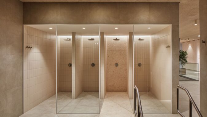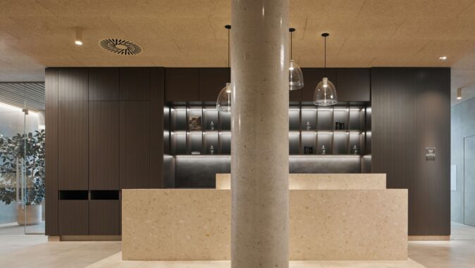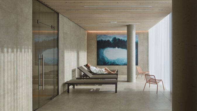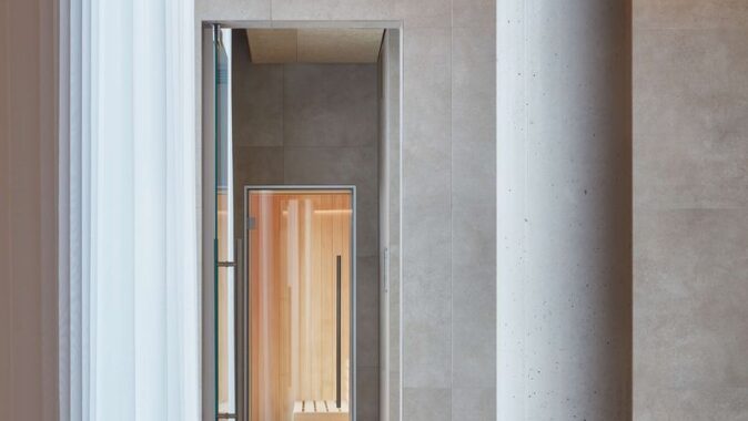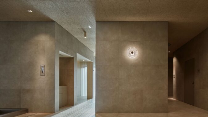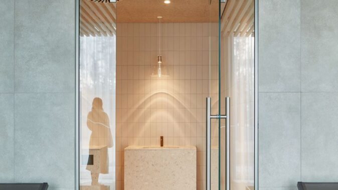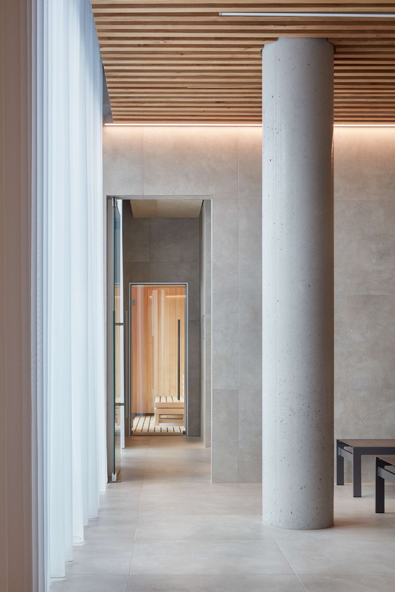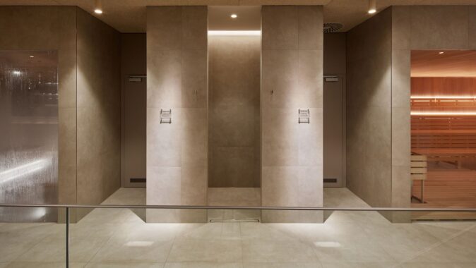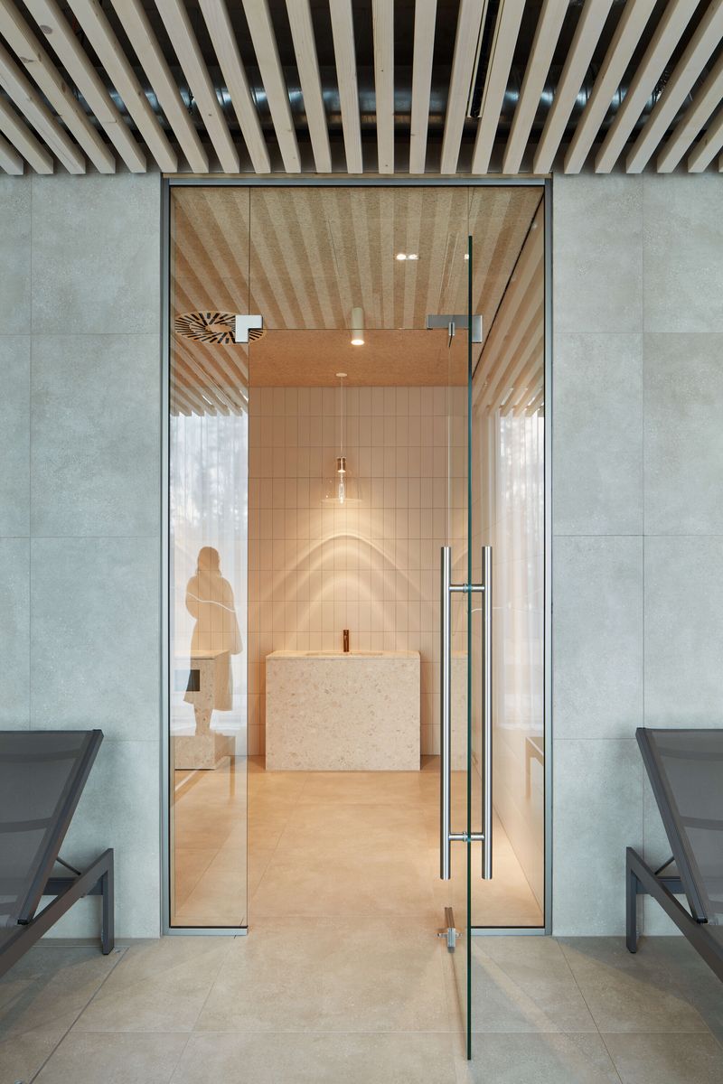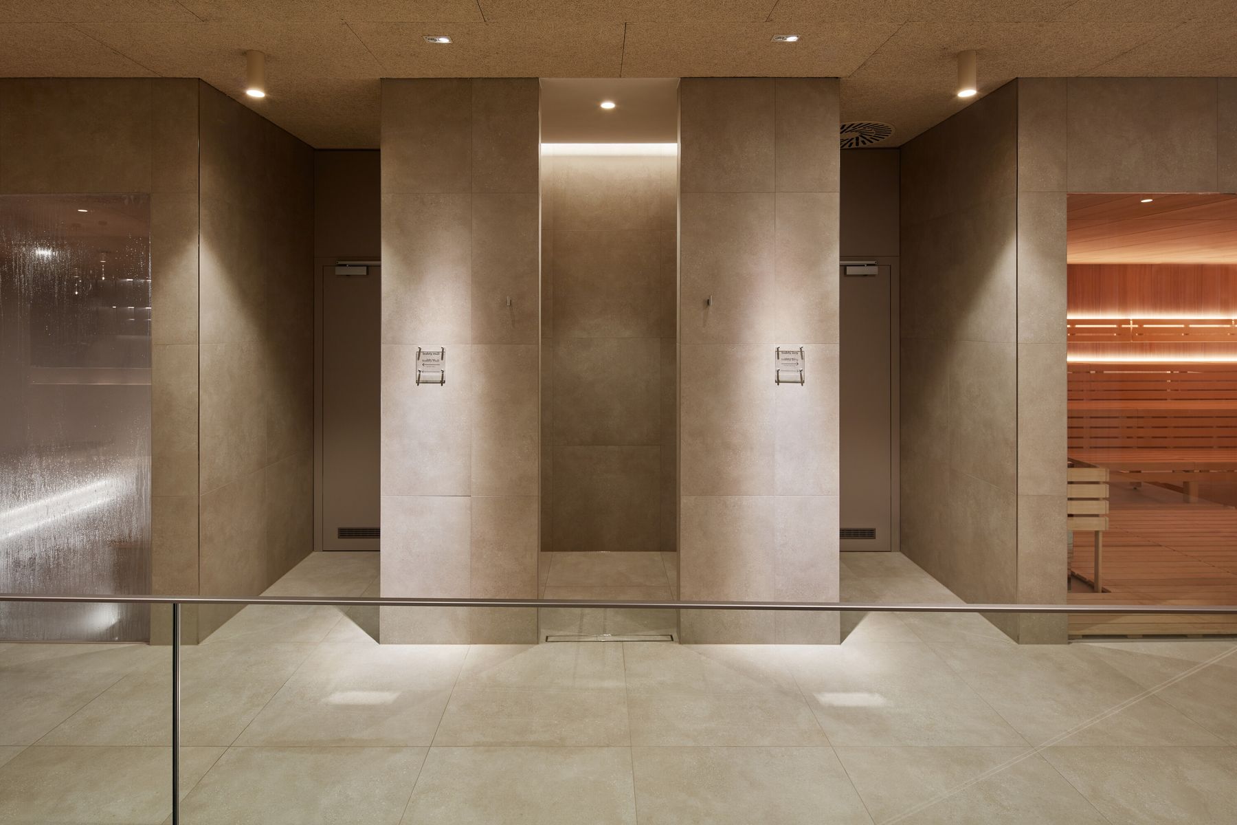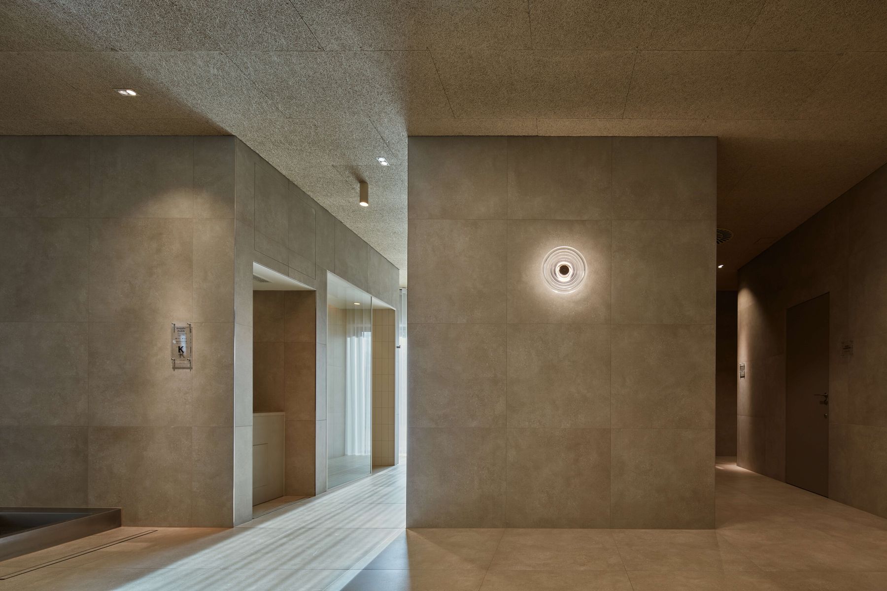 Dostavba třeboňských lázní pro nás byla velkou výzvou, snahou navázat na kvality původního lázeňského areálu ze 70. let minulého století. Pokračujeme s lokální aplikací drceného kamene, světlou dlažbou a dřevěným obkladem. To vše doplňují prvky z betonu a mramoru v podobě umyvadel nebo ledovačů.