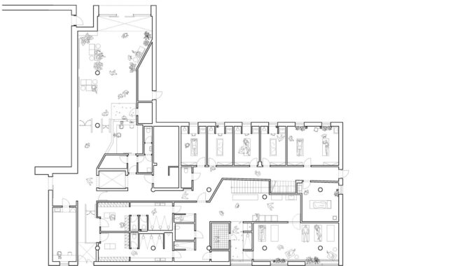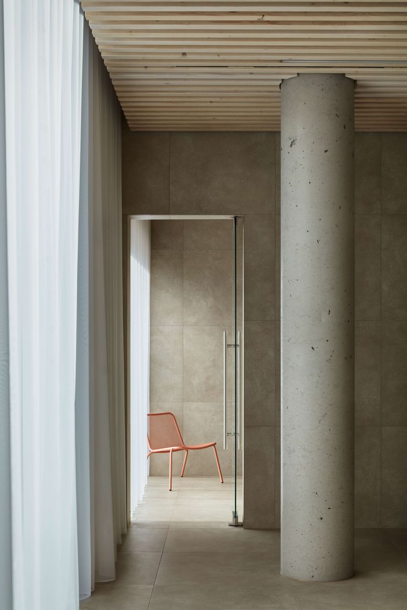 Jelikož musely úpravy dispozic respektovat existující nosný systém, navrhli jsme pro lázeňské procedury prostory, které mezi stávajícími sloupy přirozeně proplouvají.
