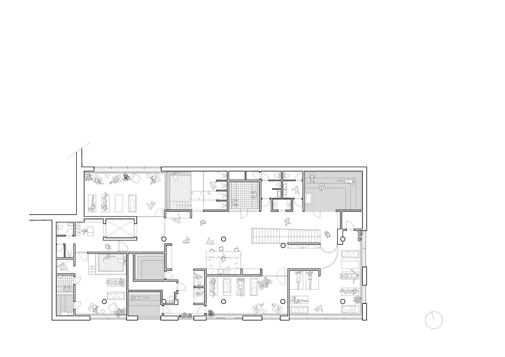 Do nitra nové budovy vtahuje návštěvníky vstupní hala, křižovatka různých provozů a spojení s původní lázeňskou budovou. Přes šatny přicházíme k parním procedurám, Knaippově chodníku a masérnám. Druhé patro nabízí několik druhů saun, páru, prosvětlené odpočívárny s výhledem do zeleně a soukromé wellness k pronajmutí.