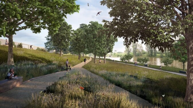Prvním projektem a zastavením výstavy je protipovodňová ochrana zoologické zahrady a Trojského nábřeží. Cílem je zachovat a podpořit přírodu tak, aby byla ochráněna místní vzácná populace užovek, a zároveň zpříjemnit nábřeží i pro návštěvníky. Díky odstranění dnešního valu se rozšíří cyklostezka a vzniknou nové pěšiny. Protipovodňová zeď neslouží jen k ochraně, ale nabídne také nové pohledy na výběhy šelem do zoo.