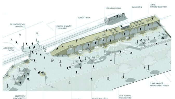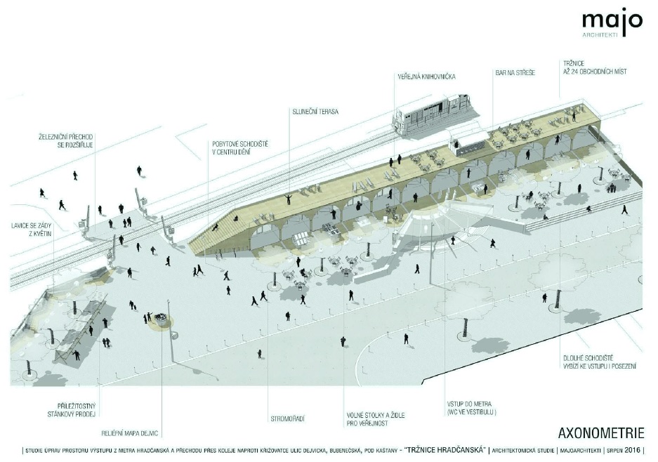 okolí výstupu z vestibulu metra, včetně plochy u kolejového přechodu pro pěší.