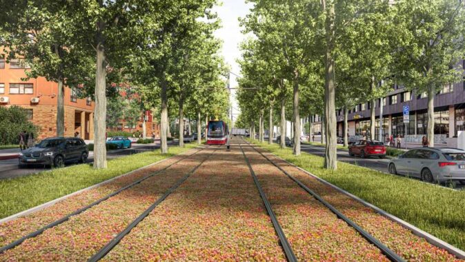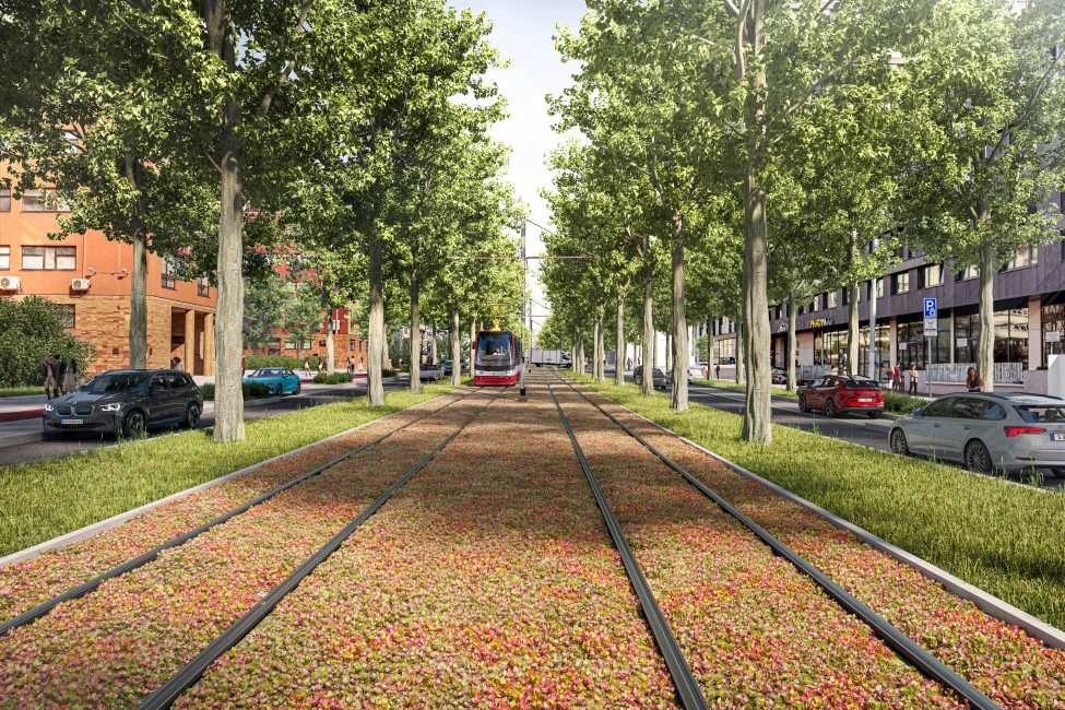 tramvajové tratě na Olšanské ulici bude zatravněn a díky vhodné úpravě bude
