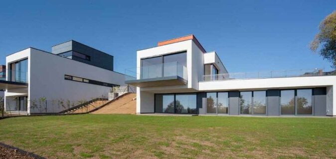 prostor ve vstupním podlaží domu je ukončen velkým prosklením a zavěšeným