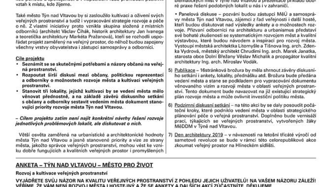 Dne 13. 3. 2019 proběhne v Týně nad Vltavou veřejná diskuse zaměřená na kultivaci veřejného prostoru našich měst. Akce je spojená s panelovou diskusí odborníků, přednáškami, výstavou, diskusí s veřejností nad výsledky ankety mezi občany Týna nad Vltavou, jíž se zúčastnilo na 800 respondentů atd.