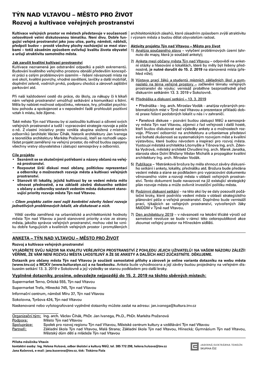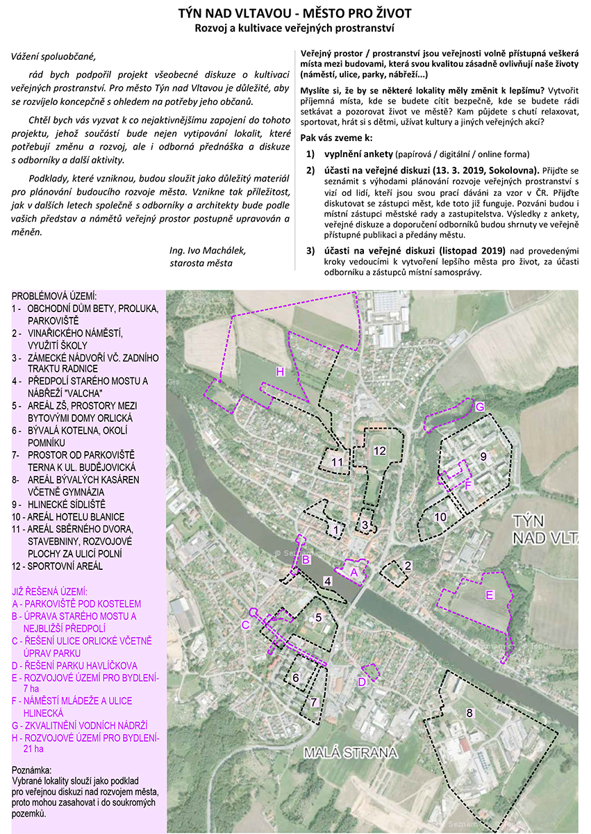 Dne 13. 3. 2019 proběhne v Týně nad Vltavou veřejná diskuse zaměřená na kultivaci veřejného prostoru našich měst. Akce je spojená s panelovou diskusí odborníků, přednáškami, výstavou, diskusí s veřejností nad výsledky ankety mezi občany Týna nad Vltavou, jíž se zúčastnilo na 800 respondentů atd.